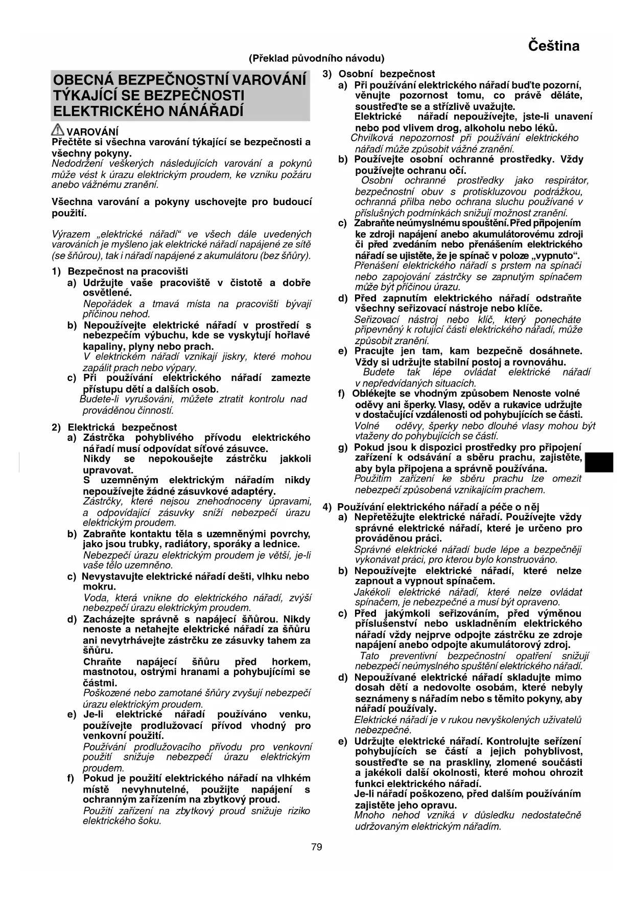 VAROVÁNÍ Přečtěte si všechna varování týkající se bezpečnosti a všechny pokyny. Nedodržení veškerých následujících varování a pokynů může vést k úrazu elektrickým proudem, ke vzniku požáru anebo vážnému zranění. Všechna varování a pokyny uschovejte pro budoucí použití. Výrazem „elektrické nářadí“ ve všech dále uvedených varováních je myšleno jak elektrické nářadí napájené ze sítě (se šňůrou), tak i nářadí napájené z akumulátoru (bez šňůry).