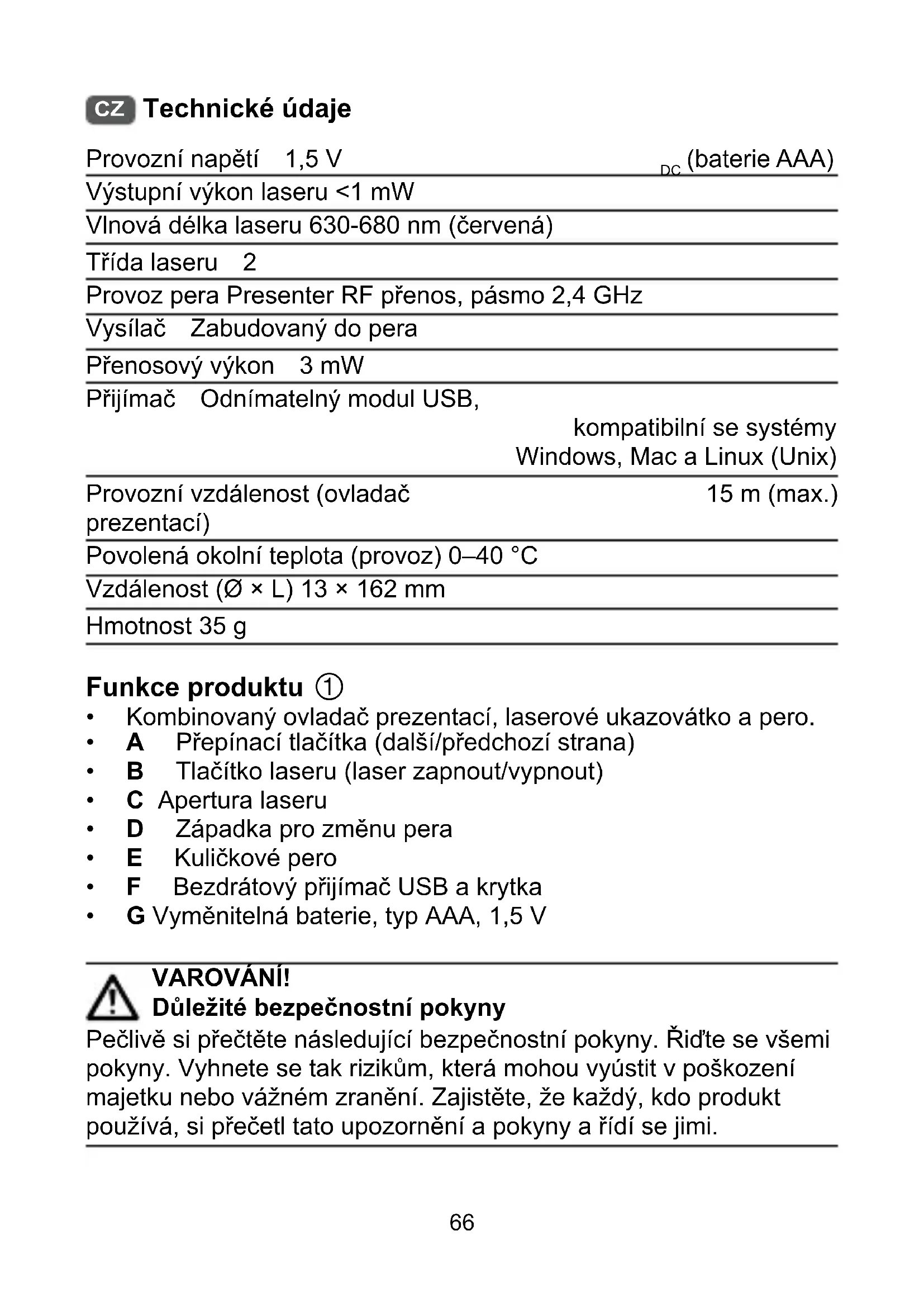 (baterie AAA) Výstupní výkon laseru <1 mW Vlnová délka laseru 630-680nm(červená) Třídalaseru 2 Provoz pera Presenter RFpřenos,pásmo2,4GHz Vysílač Zabudovaný do pera Přenosovývýkon 3 mW Přijímač Odnímatelný modul USB, kompatibilní se systémy Windows, Mac a Linux (Unix) Provoznívzdálenost(ovladač prezentací) 15 m (max.) Povolená okolní teplota (provoz) 0–40 °C Vzdálenost (Ø × L) 13 × 162 mm Hmotnost 35 g Funkce produktu