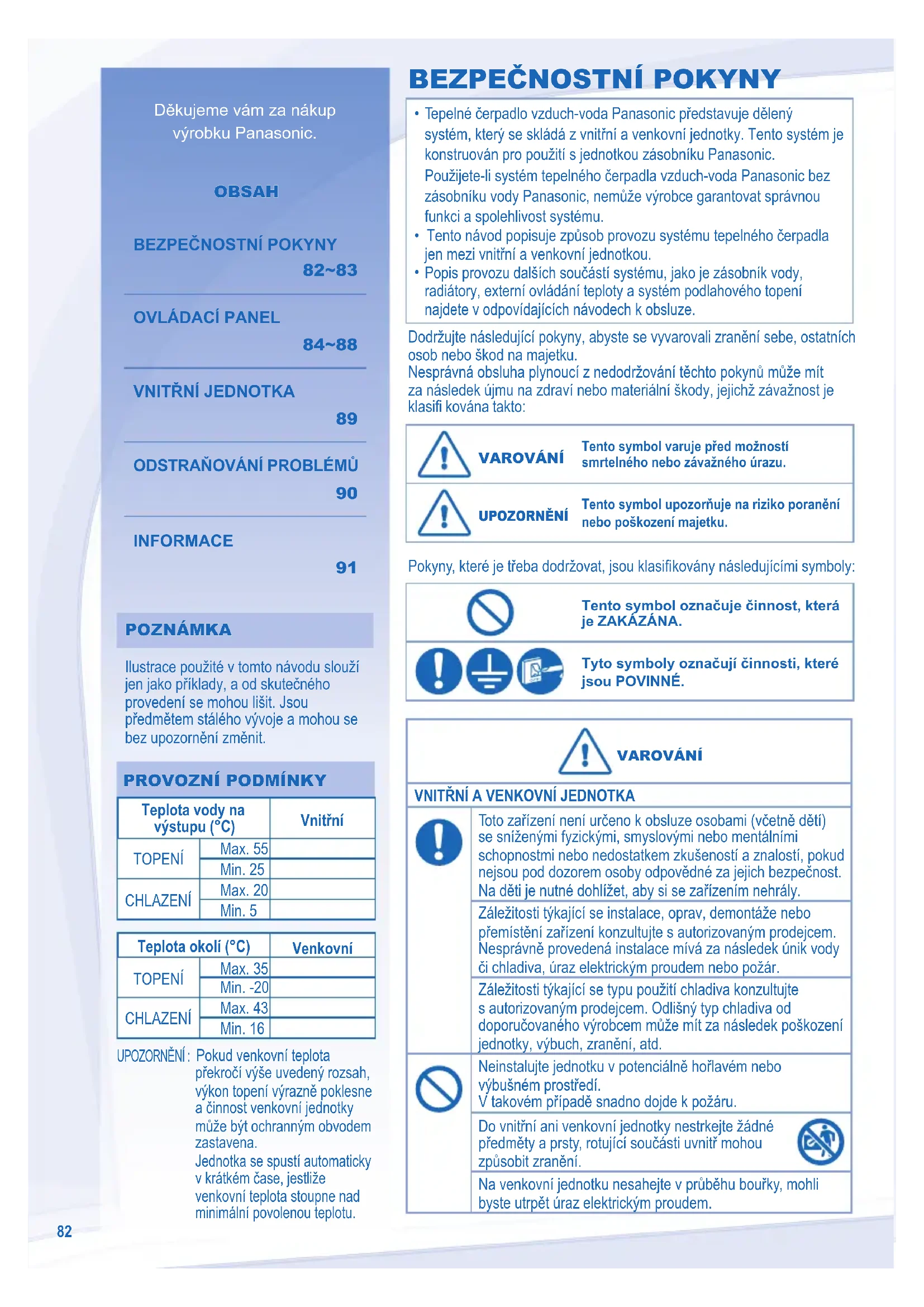 Teplota vody na výstupu (°C) Vnitřní TOPENÍ Max. 55 Min. 25 CHLAZENÍ Max. 20 Min. 5 Teplota okolí (°C) Venkovní TOPENÍ Max. 35 Min. -20 CHLAZENÍ Max. 43 Min. 16 UPOZORNĚNÍ : Pokud venkovní teplota překročí výše uvedený rozsah, výkon topení výrazně poklesne a činnost venkovní jednotky může být ochranným obvodem zastavena. Jednotka se spustí automaticky v krátkém čase, jestliže venkovní teplota stoupne nad minimální povolenou teplotu.CZECH