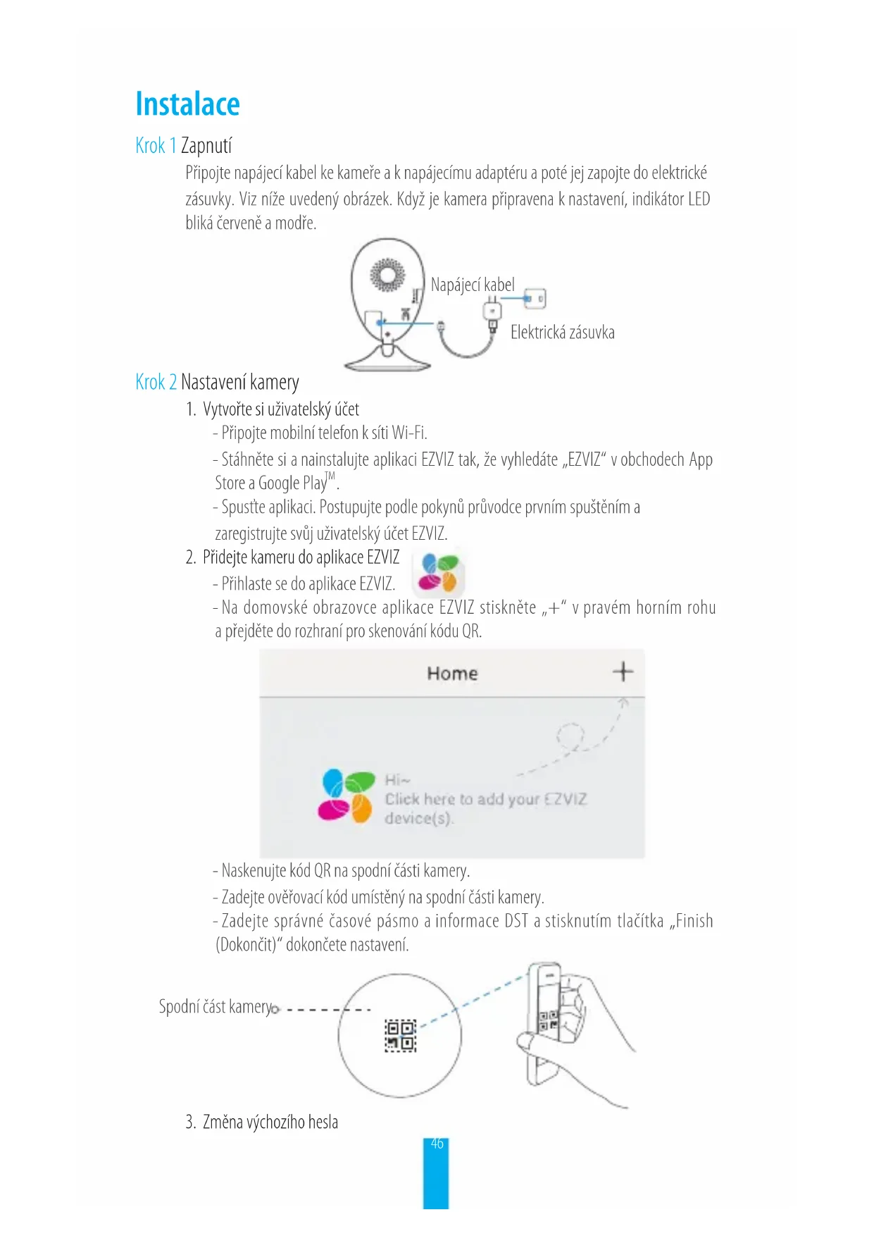 - Přihlaste se do aplikace EZVIZ. - Na domovské obrazovce aplikace EZVIZ stiskněte „+“ vpravém horním rohu apřejděte do rozhraní pro skenování kódu QR. - Naskenujte kód QR na spodní části kamery. - Zadejte ověřovací kód umístěný na spodní části kamery. - Zadejte správné časové pásmo ainformace DST astisknutím tlačítka „Finish (Dokončit)“ dokončete nastavení.