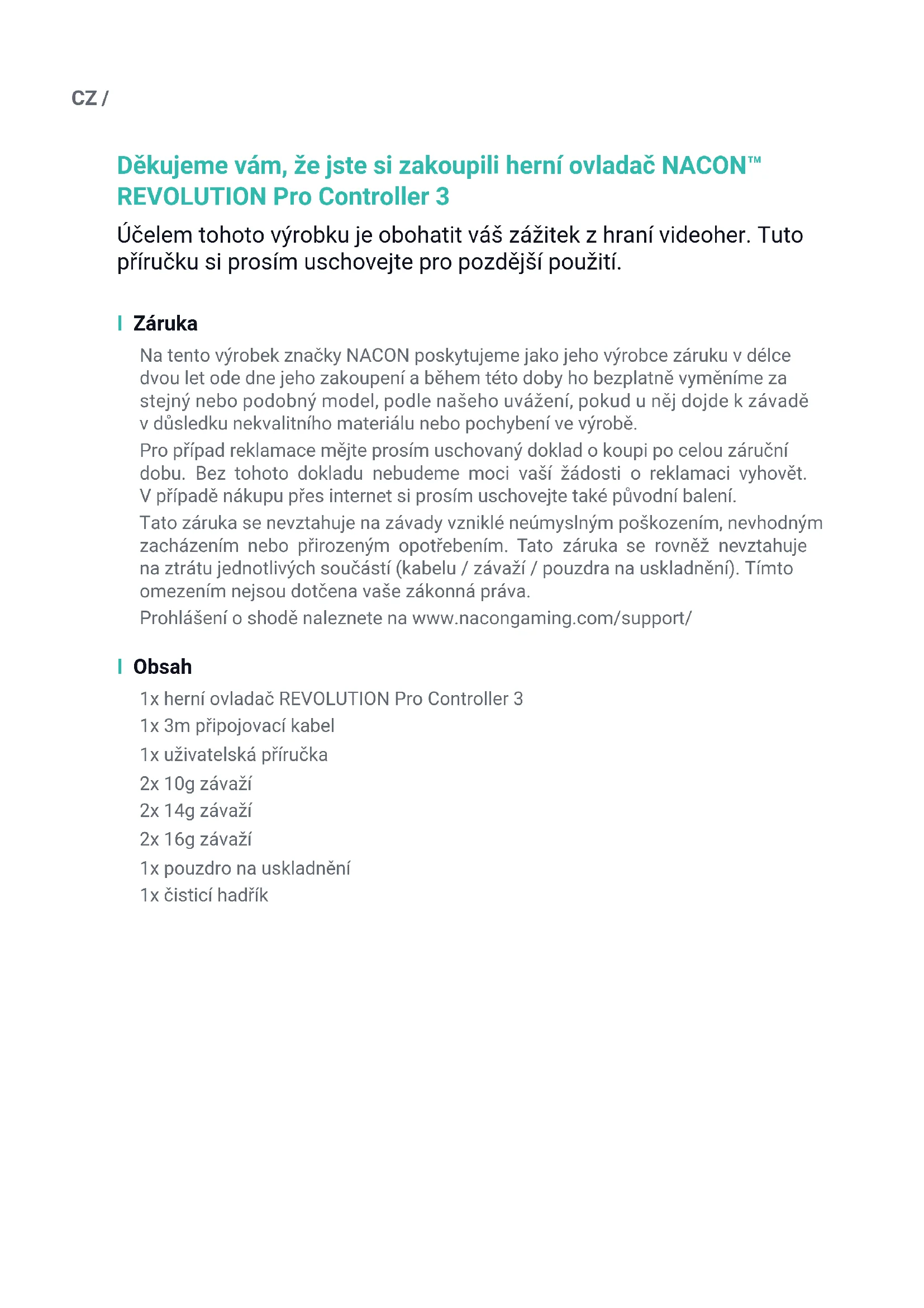 Recyklace S tímto výrobkem by se nemělo nakládat jako s běžným domovním odpadem. Místo toho ho prosím zaneste na příslušné sběrné místo. Recyklace je důležitá, neboť snižováním množství odpadu na skládkách přispívá k ochraně životního prostředí. Platí pouze pro EU a Turecko. I Důležitá bezpečnostní opatření 1/ Tento výrobek je určen k použití pouze ve vnitřních prostorách. Nevystavujte ho přímému slunečnímu záření nebo špatnému počasí. 2/ Výrobek nevystavujte stříkající vodě, kapkám deště nebo vlhkosti. Neponořujte ho do kapaliny. 3/ Výrobek nevystavujte prachu, vysoké vlhkosti, vysokým teplotám nebo mecha- nickému šoku. 4/ Výrobek nepoužívejte, je-li poškozený. Výrobek nerozebírejte, uvnitř nejsou žád- né opravitelné součásti. 5/ K čištění povrchu používejte výhradně jemný, čistý a vlhký hadřík. Čisticí pro- středky mohou poškodit povrchovou úpravu a proniknout dovnitř. 6/ Výrobek nepřenášejte za kabel. 7/ Toto zařízení není navrženo pro používání osobami se sníženými fyzickými, smyslovými nebo duševními schopnostmi nebo osobami bez potřebných zkušeností či znalostí, jestliže se jim předtím nedostalo poučení nebo instrukcí ohledně používání tohoto zařízení od osoby zodpovědné za jejich bezpečnost. Výrobek nenechávejte bez dozoru a uchovávejte ho mimo dosah dětí. Nevhodné pro děti mladší sedmi let kvůli riziku omotání kabelu okolo krku. I Ergonomie Držení rukou ve stejné pozici může po delší době vyvolat bolest. Dochází-li k tomu opakovaně, poraďte se prosím s lékařem. Jako prevenci vám doporučujeme, abyste si každou hodinu udělali patnáctiminutovou přestávku. I Informace o technické podpoře E-mail: support@nacongaming.com Web: www.nacongaming.comSK / Ďakujeme vám, že ste si zakúpili herný ovládač NACON™ REVOLUTION Pro Controller 3. Účelom tohto výrobku je obohatiť váš zážitok z hrania videohier. Túto príručku si prosím uschovajte pre neskoršie použitie. I Záruka Na tento výrobok značky NACON poskytujeme ako jeho výrobca záruku v dĺžke dva roky odo dňa jeho zakúpenia a behom tejto doby ho bezplatne vymeníme za rovnaký alebo podobný model, podľa nášho uváženia, ak u neho dôjde k poruche alebo kazu v dôsledku nekvalitného materiálu alebo pochybenia vo výrobe. Pre prípad reklamácie majte prosím uschovaný doklad o kúpe počas celej záručnej doby. Bez tohto dokladu nebudeme môcť vašej žiadosti o reklamáciu vyhovieť. V prípade nákupu cez internet si prosím uschovajte aj pôvodné balenie. Táto záruka sa nevzťahuje na kazy vzniknuté neúmyselným poškodením, nevhodným zaobchádzaním alebo prirodzeným opotrebovaním. Táto záruka sa taktiež nevzťahuje na stratu jednotlivých súčastí (kábla / závaží / puzdra na uskladnenie). Týmto obmedzením nie sú ovplyvnené vaše zákonné práva. Prehlásenie o súhlase s podmienkami nájdete na www.nacongaming.com/support/ I Obsah 1x herný ovládač REVOLUTION Pro Controller 3 1x 3m pripojovací kábel 1x užívateľská príručka 2x 10g závažie 2x 14g závažie 2x 16g závažie 1x puzdro na uskladnenie 1x čistiaca handričkaSK / I Popis prvkov