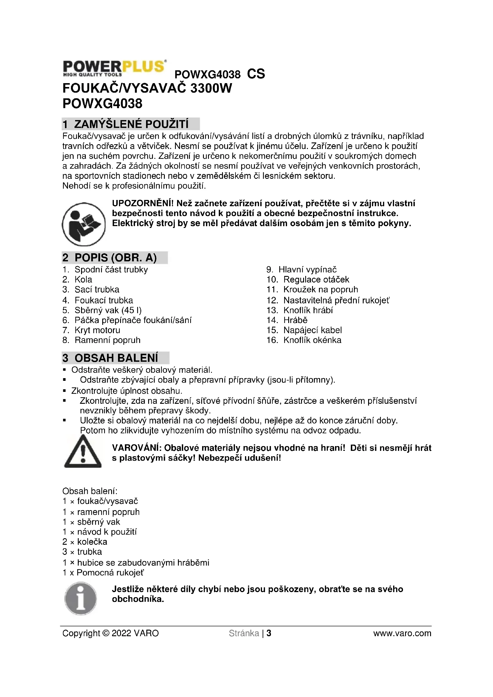 Elektronická regulace otáček Ano Kovový nůž Ano Ovládací rukojeť Ano Bezpečnostní vypínač Ano Měkký úchop Ano Typ druhé rukojeti Nastavitelná přídavná rukojeť Funkce drcení Ano Funkce ofukování Ano Funkce vysávání Ano Funkce hrabání Ano Rychle odpojitelný sběrný vak Ano Dvojité podpůrné kolečko Ano Vestavěné hrábě Ano Snadno čistitelné okénko AnoPOWXG4038 CS Copyright © 2022 VARO Stránka | 10 www.varo.com 12 HLUČNOST Hodnoty emisí hluku se měří podle příslušné normy. (K=3) Úroveň akustického tlaku LpA 84 dB(A) Úroveň akustického výkonu LwA 106 dB(A) POZOR! Hladina akustického tlaku může přesáhnout 85 dB(A), v takovém případě použijte ochranu sluchu. aw (Vibrace) 3.7m/s² K = 1,5 m/s² 13 ZÁRUKA