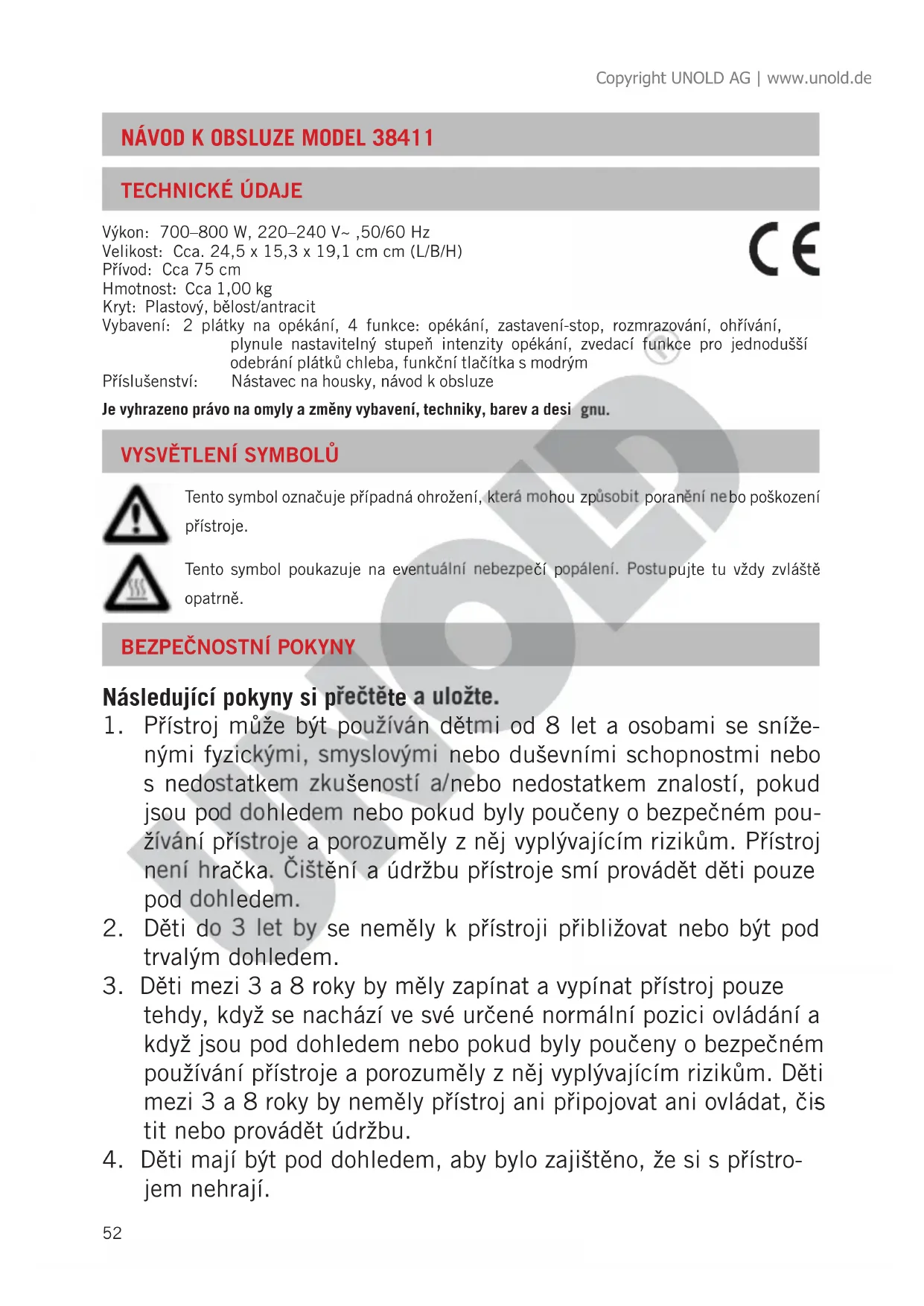 Naše vyrobené přístroje mají vysoce kvalitní standard pro zajišt’ění jejich dlouhé životnosti. Pravidelné údrž- by i opravy odborně provedeny naším prodejním servisem mohou mít vliv na prodloužení provozní životnosti přístroje. Když je přístroj vadný a už ho nelze opravit, neopomeňte prosím: Toto zařízení nepatří do běžného domovního odpadku, ale musí být předáno do autorizované sběrny pro recyklování elektrických nebo elek- tronických zařízení. Separátní sběr a recyklování odpadních produktů umožňuje šetření přírodních zdrojů a zajišt’uje, aby byly odpady likvidovány způsobem, který je pro zdraví a kologii přijatelný. Na naše přístroje poskytujeme záruku v trvání 24 měsíců (u průmyslového využití 12 měsíců) od data koupě výrobku, záruka se vztahuje na poškození, která prokazatelne vznikla při správném použití v důsledku výrobních vad. Po dobu záruky budeme odstraňovat materiální i výrobní vady opravou nebo výměnou podle našeho uvážení. Poskytnutí záruky výhradně platí pro zařízení prodány v Německu i Rakousku. V jiných zemích se obrat’te prosím na kompetentní dovozce. Přístroje, na které bylo uplatňováno odstranění vad, zašlete prosím smechanicky vyhotovenou kopií nákupního dokladu, ze kterého musí být bez- podmínečně patrný datum nákupu i s popisem vad, přístroj musí být bezpečně zabalen a nafrankován na náš záruční servis. V připadě opravněné záruky jsou kupujícím vraceny poštovní poplatky v Německu i Rakousku. Tato záruka se nevztahuje na poškození způsobená opotřebením, nesprávným zacházením a nedodržováním návodů k údržbě a obsluze. Záruční doba zaniká, když opravy nebo manipulace s přístrojem byly provedeny třetí osobou. Eventuální nároky zákazníka vůči prodejci/ obchodníku nejsou touhle zárukou omezeny. Copyright UNOLD AG | www.unold.de59 Moc: 700–800W, 220–240V~, 50/60 Hz Wymiary: (dł./szer./wys.) 24,5 x 15,3 x 19,1 cm cm bez nasadki do bułek Długość kabla: Ok. 75 cm Waga: Ok. 1,00kg Obudowa: Tworzywa sztucznego, biała / antracytowa Wyposażenie: Opiekacz automatyczny na dwie kromki, bezstopniowe nastawienie stopnia opiekania, 4 funkcje: opiekanie, podgrzewanie, odmrożenie, stop, wszystkie przyciski ze światełkami kontrolnymi, automatyczne wyśrodkowywanie kromek, automatyczny wyłącznik, wyjmowana szuflada na okruchy Akcesoria: Instrukcja obsługi, nasadka do bułek Zmiany i błędy w opisie wyposażenia, technice, kolorach i konstrukcji są zastrzeżone.
