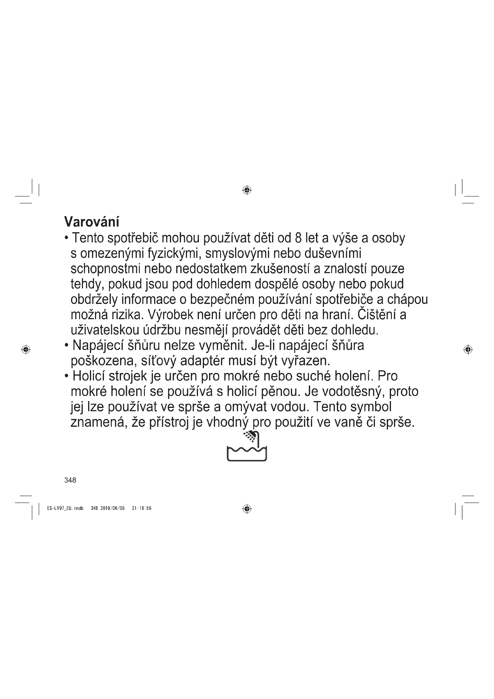 - Holicí strojek je určen pro mokré nebo suché holení. Pro mokré holení se používá s holicí pěnou. Je vodotěsný, proto jej lze používat ve sprše a omývat vodou. Tento symbol znamená, že přístroj je vhodný pro použití ve vaně či sprše. ES-LV97_EU.indb 348 2019/06/05 21:18:56349 TR RO H SK CZ PL FIN S N P DK E NL I F D GB