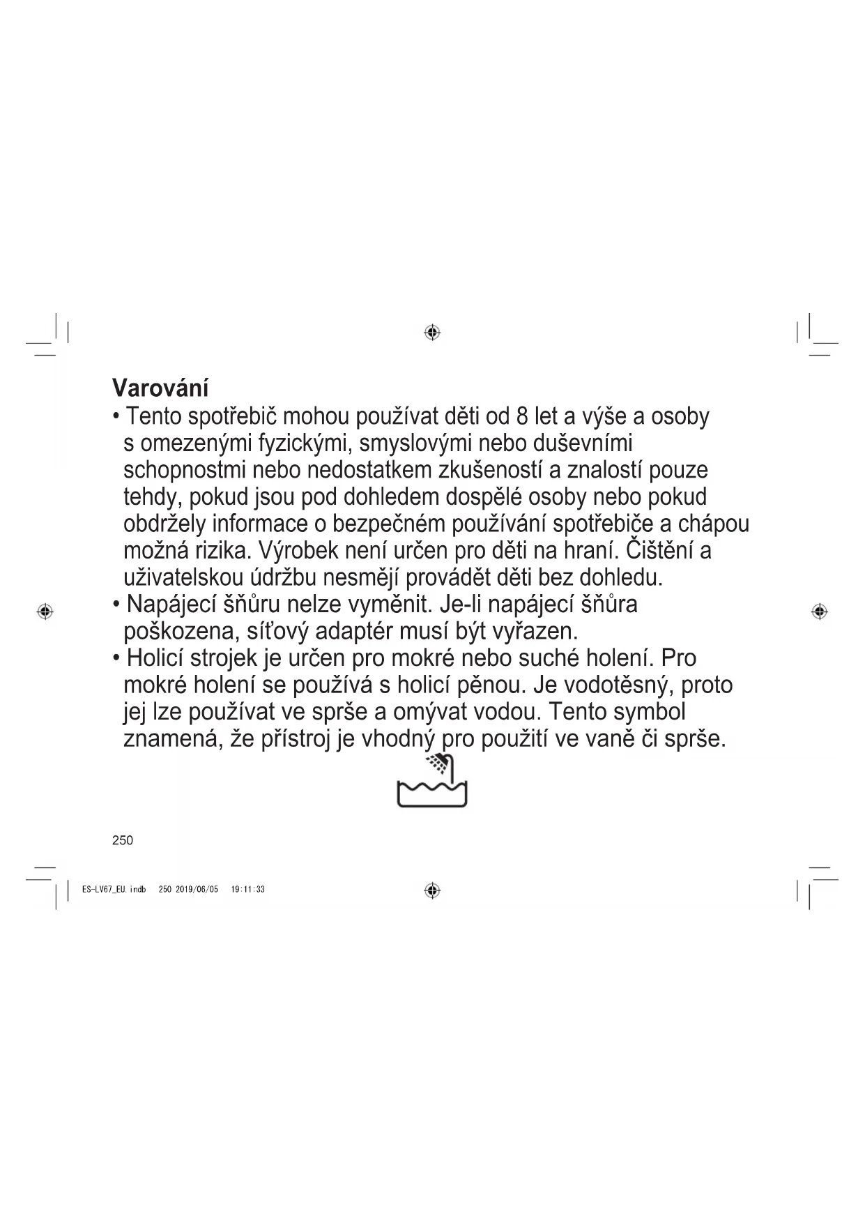 - Holicí strojek je určen pro mokré nebo suché holení. Pro mokré holení se používá s holicí pěnou. Je vodotěsný, proto jej lze používat ve sprše a omývat vodou. Tento symbol znamená, že přístroj je vhodný pro použití ve vaně či sprše. ES-LV67_EU.indb 250 2019/06/05 19:11:33251 TR RO H SK CZ PL FIN S N P DK E NL I F D GB