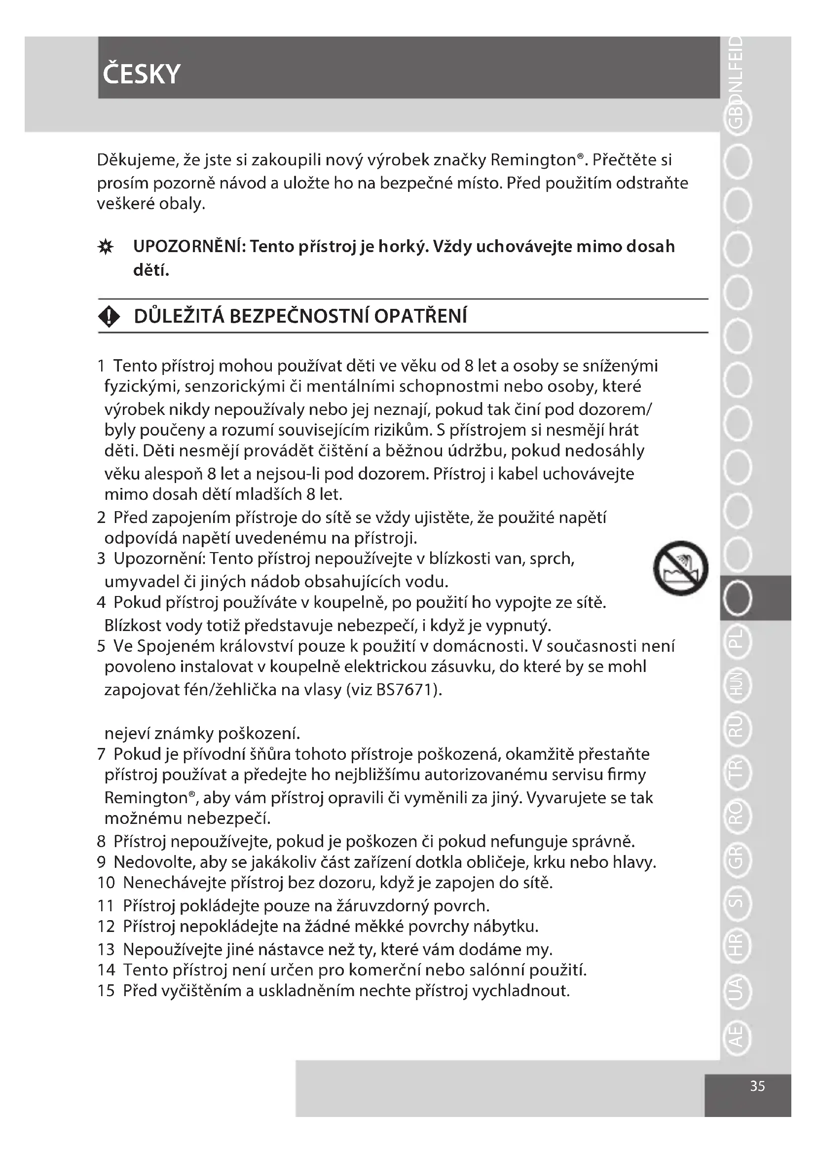 Aby nedochádzalo k ohrozeniu zdravia a životného prostredia vplyvom nebezpečných látok v elektrických a elektronických výrobkoch, nesmú byť spotrebiče označené týmto symbolom likvidované s netriedeným komunálnym odpadom. Je nutné ich triediť, znovu použiť alebo recyklovať. SLOVENČINA35 Děkujeme, že jste si zakoupili nový výrobek značky Remington®. Přečtěte si prosím pozorně návod a uložte ho na bezpečné místo. Před použitím odstraňte veškeré obaly. , UPOZORNĚNÍ: Tento přístroj je horký. Vždy uchovávejte mimo dosah dětí. F DŮLEŽITÁ BEZPEČNOSTNÍ OPATŘENÍ 1 Tento přístroj mohou používat děti ve věku od 8 let a osoby se sníženými fyzickými, senzorickými či mentálními schopnostmi nebo osoby, které výrobek nikdy nepoužívaly nebo jej neznají, pokud tak činí pod dozorem/ byly poučeny a rozumí souvisejícím rizikům. S přístrojem si nesmějí hrát děti. Děti nesmějí provádět čištění a běžnou údržbu, pokud nedosáhly věku alespoň 8 let a nejsou-li pod dozorem. Přístroj i kabel uchovávejte mimo dosah dětí mladších 8 let. 2 Před zapojením přístroje do sítě se vždy ujistěte, že použité napětí odpovídá napětí uvedenému na přístroji. 3 Upozornění: Tento přístroj nepoužívejte v blízkosti van, sprch, umyvadel či jiných nádob obsahujících vodu. 4 Pokud přístroj používáte v koupelně, po použití ho vypojte ze sítě. Blízkost vody totiž představuje nebezpečí, i když je vypnutý. 5 Ve Spojeném království pouze k použití v domácnosti. V současnosti není povoleno instalovat v koupelně elektrickou zásuvku, do které by se mohl zapojovat fén/žehlička na vlasy (viz BS7671). 6Šňůruneomotávejtekolempřístroje.Šňůrupravidelněkontrolujte,zda nejeví známky poškození. 7 Pokud je přívodní šňůra tohoto přístroje poškozená, okamžitě přestaňte přístroj používat a předejte ho nejbližšímu autorizovanému servisu rmy Remington®, aby vám přístroj opravili či vyměnili za jiný. Vyvarujete se tak možnému nebezpečí. 8 Přístroj nepoužívejte, pokud je poškozen či pokud nefunguje správně. 9 Nedovolte, aby se jakákoliv část zařízení dotkla obličeje, krku nebo hlavy. 10 Nenechávejte přístroj bez dozoru, když je zapojen do sítě. 11 Přístroj pokládejte pouze na žáruvzdorný povrch. 12 Přístroj nepokládejte na žádné měkké povrchy nábytku. 13 Nepoužívejte jiné nástavce než ty, které vám dodáme my. 14 Tento přístroj není určen pro komerční nebo salónní použití. 15 Před vyčištěním a uskladněním nechte přístroj vychladnout. ČESKY GBDNLFEIDKSFINPSKCZ HUN PLRUTRROGRSI AE HR UA36