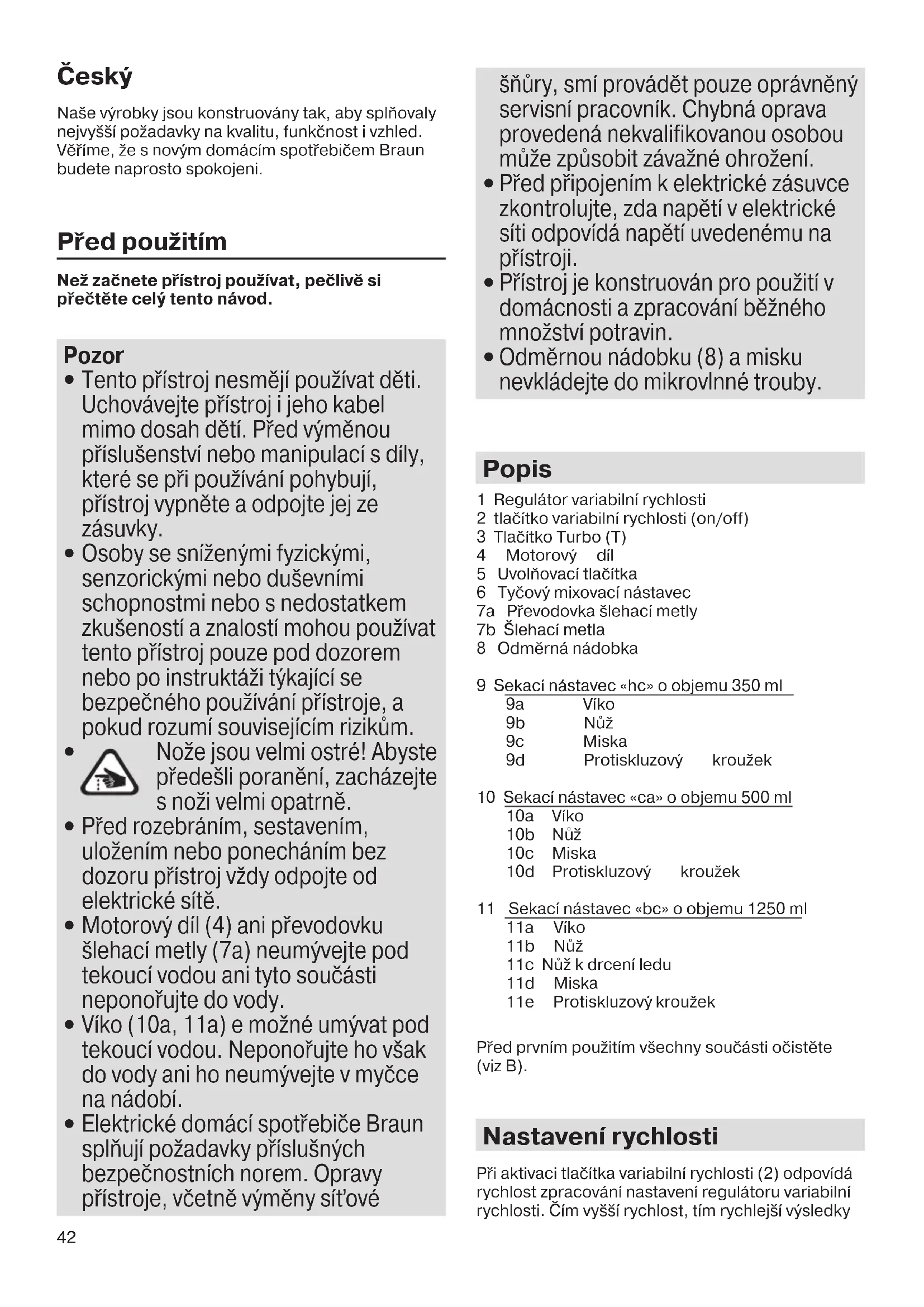 Elektrické domácí spotřebiče Braun splňují požadavky příslušných bezpečnostních norem. Opravy přístroje, včetně výměny síťové šňůry, smí provádět pouze oprávněný servisní pracovník. Chybná oprava provedená nekvalifikovanou osobou může způsobit závažné ohrožení.