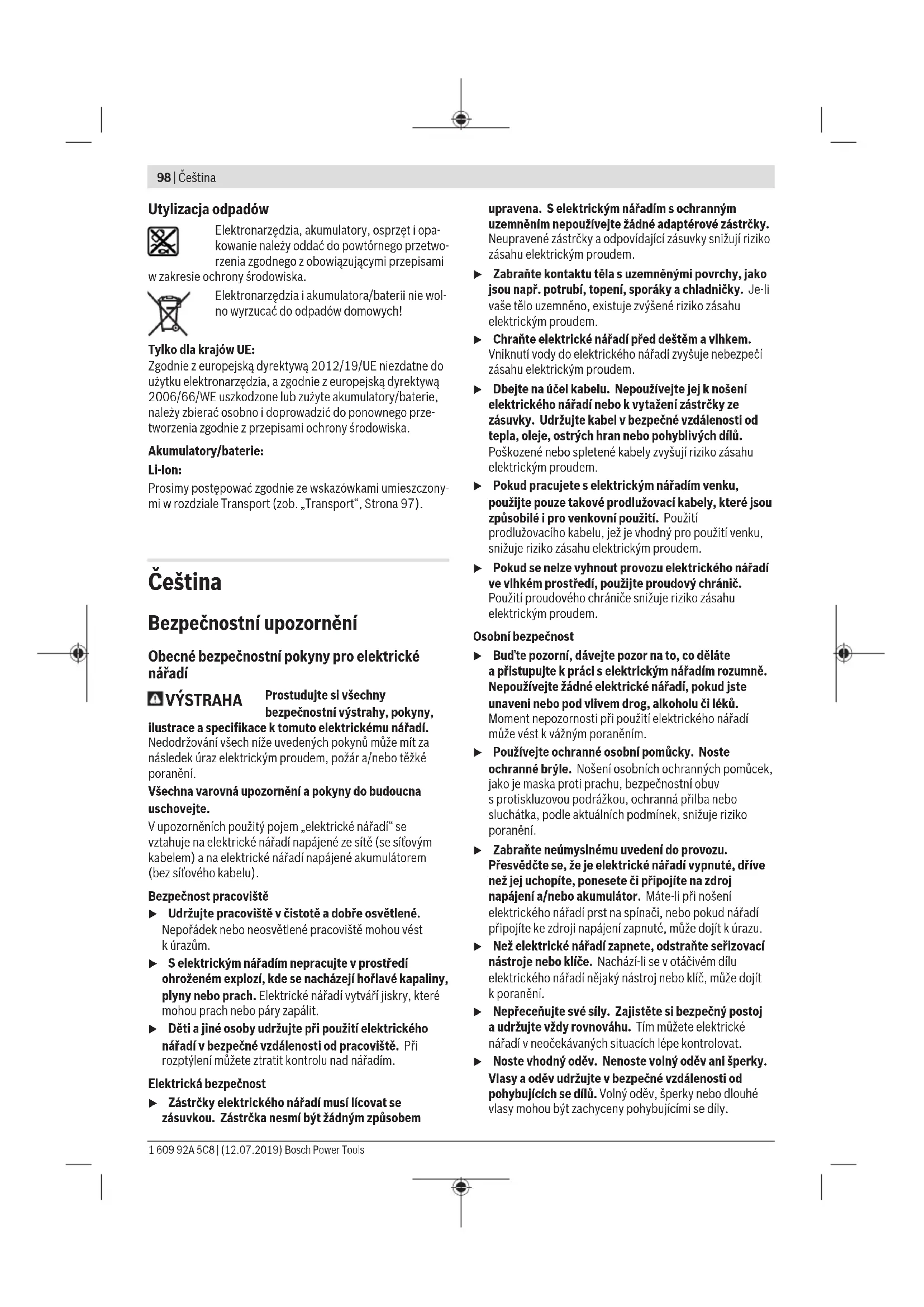 Wysoki zakres prędkości obrotowej – do wiercenia otworów o małych średnicach. u Przełącznik biegów należy zawsze przesuwać aż do oporu. W przeciwnym wypadku może dojść do uszkodze- nia elektronarzędzia. Termiczny wyłącznik przeciążeniowy Stosowanego zgodnie z przeznaczeniem elektronarzędzia nie da się przeciążyć. W przypadku zbyt silnego obciążenia lub po przekroczeniu dopuszczalnego zakresu temperatury roboczej dochodzi do zredukowania prędkości obrotowej. Elektronarzędzie pracuje z pełną prędkością obrotową do- piero po ponownym osiągnięciu dopuszczalnej temperatury roboczej. Automatyczna blokada wrzeciona (Auto‑Lock) Przy zwolnionym włączniku/wyłączniku (11) wrzeciono, a wraz z nim uchwyt narzędziowy są zablokowane. Umożliwia to wkręcanie wkrętów również przy wyładowa- nym akumulatorze lub używanie elektronarzędzia jako śrubo- kręta. Wskazówki dotyczące pracy u Przed przyłożeniem elektronarzędzia do wkrętu/śru- by należy je wyłączyć. Obracające się narzędzia robocze mogą ześlizgnąć się z nakrętki lub z łba śruby. Przed wkręcaniem większych, dłuższych śrub w twarde ma- teriały, zaleca się wykonanie nawiercenia na ok. 2/3 długo- ści śruby, o średnicy równej średnicy gwintu śruby. Do zdejmowania końcówek wkręcających oraz uniwersalne- go uchwytu na końcówki, można posłużyć się narzędziem. Zaczep do paska Za pomocą zaczepu (6) można wygodnie zawiesić elektrona- rzędzie, np. pasku. Dzięki temu obie ręce są wolne, a elek- tronarzędzie znajduje się w zasięgu ręki. Konserwacja i serwis Konserwacja i czyszczenie u Przed przystąpieniem do jakichkolwiek prac przy elektronarzędziu (np. prace konserwacyjne, wymiana osprzętu itp.), a także na czas transportu i przechowy- wania należy wyjąć z niego akumulator. Niezamierzone uruchomienie włącznika/wyłącznika grozi skaleczeniem. u Utrzymywanie urządzenia i szczelin wentylacyjnych w czystości gwarantuje prawidłową i bezpieczną pracę. Obsługa klienta oraz doradztwo dotyczące użytkowania Ze wszystkimi pytaniami, dotyczącymi naprawy ikonserwa- cji nabytego produktu oraz dostępu do części zamiennych, prosimy zwracać się do punktów obsługi klienta. Rysunki techniczne oraz informacje o częściach zamiennych można znaleźć pod adresem: www.bosch-pt.com Nasz zespół doradztwa dotyczącego użytkowania odpowie na wszystkie pytania związane z produktami firmy Bosch oraz ich osprzętem. Przy wszystkich zgłoszeniach oraz zamówieniach części za- miennych konieczne jest podanie 10‑cyfrowego numeru ka- talogowego, znajdującego się na tabliczce znamionowej pro- duktu. Polska Robert Bosch Sp. z o.o. Serwis Elektronarzędzi Ul. Jutrzenki 102/104 02-230 Warszawa Na www.serwisbosch.com znajdą Państwo wszystkie szcze- góły dotyczące usług serwisowych online. Tel.: 22 7154450 Faks: 22 7154440 E-Mail: bsc@pl.bosch.com www.bosch-pt.pl Transport Załączone w dostawie akumulatory litowo-jonowe podlegają wymaganiom przepisów dotyczących towarów niebezpiecz- nych. Akumulatory mogą być transportowane drogą lądową przez użytkownika, bez konieczności spełnienia jakichkol- wiek dalszych warunków. W przypadku przesyłki przez osoby trzecie (np. transport drogą powietrzną lub za pośrednictwem firmy spedycyjnej) należy dostosować się do szczególnych wymogów dotyczą- cych opakowania i oznakowania towaru. W takim wypadku podczas przygotowywania towaru do wysyłki należy skonsul- tować się z ekspertem ds. towarów niebezpiecznych. Akumulatory można wysyłać tylko wówczas, gdy ich obudo- wa nie jest uszkodzona. Odsłonięte styki należy zakleić, a akumulator zapakować wtaki sposób, aby nie mógł on się poruszać (przesuwać) w opakowaniu. Należy wziąć też pod uwagę ewentualne inne przepisy prawa krajowego. Bosch Power Tools 1 609 92A 5C8 | (12.07.2019)98 | Čeština Utylizacja odpadów Elektronarzędzia, akumulatory, osprzęt i opa- kowanie należy oddać do powtórnego przetwo- rzenia zgodnego z obowiązującymi przepisami w zakresie ochrony środowiska. Elektronarzędzia i akumulatora/baterii nie wol- no wyrzucać do odpadów domowych! Tylko dla krajów UE: Zgodnie z europejską dyrektywą 2012/19/UE niezdatne do użytku elektronarzędzia, a zgodnie z europejską dyrektywą 2006/66/WE uszkodzone lub zużyte akumulatory/baterie, należy zbierać osobno i doprowadzić do ponownego prze- tworzenia zgodnie z przepisami ochrony środowiska. Akumulatory/baterie: Li-Ion: Prosimy postępować zgodnie ze wskazówkami umieszczony- mi w rozdziale Transport (zob. „Transport“, Strona97). Čeština Bezpečnostní upozornění Obecné bezpečnostní pokyny pro elektrické nářadí VÝSTRAHA Prostudujte si všechny bezpečnostní výstrahy, pokyny, ilustrace aspecifikace ktomuto elektrickému nářadí. Nedodržování všech níže uvedených pokynů může mít za následek úraz elektrickým proudem, požár a/nebo těžké poranění. Všechna varovná upozornění apokyny do budoucna uschovejte. Vupozorněních použitý pojem „elektrické nářadí“ se vztahuje na elektrické nářadí napájené ze sítě (se síťovým kabelem) ana elektrické nářadí napájené akumulátorem (bez síťového kabelu). Bezpečnost pracoviště u Udržujte pracoviště včistotě adobře osvětlené. Nepořádek nebo neosvětlené pracoviště mohou vést kúrazům. u Selektrickým nářadím nepracujte vprostředí ohroženém explozí, kde se nacházejí hořlavé kapaliny, plyny nebo prach. Elektrické nářadí vytváří jiskry, které mohou prach nebo páry zapálit. u Děti ajiné osoby udržujte při použití elektrického nářadí vbezpečné vzdálenosti od pracoviště. Při rozptýlení můžete ztratit kontrolu nad nářadím. Elektrická bezpečnost u Zástrčky elektrického nářadí musí lícovat se zásuvkou. Zástrčka nesmí být žádným způsobem upravena. Selektrickým nářad