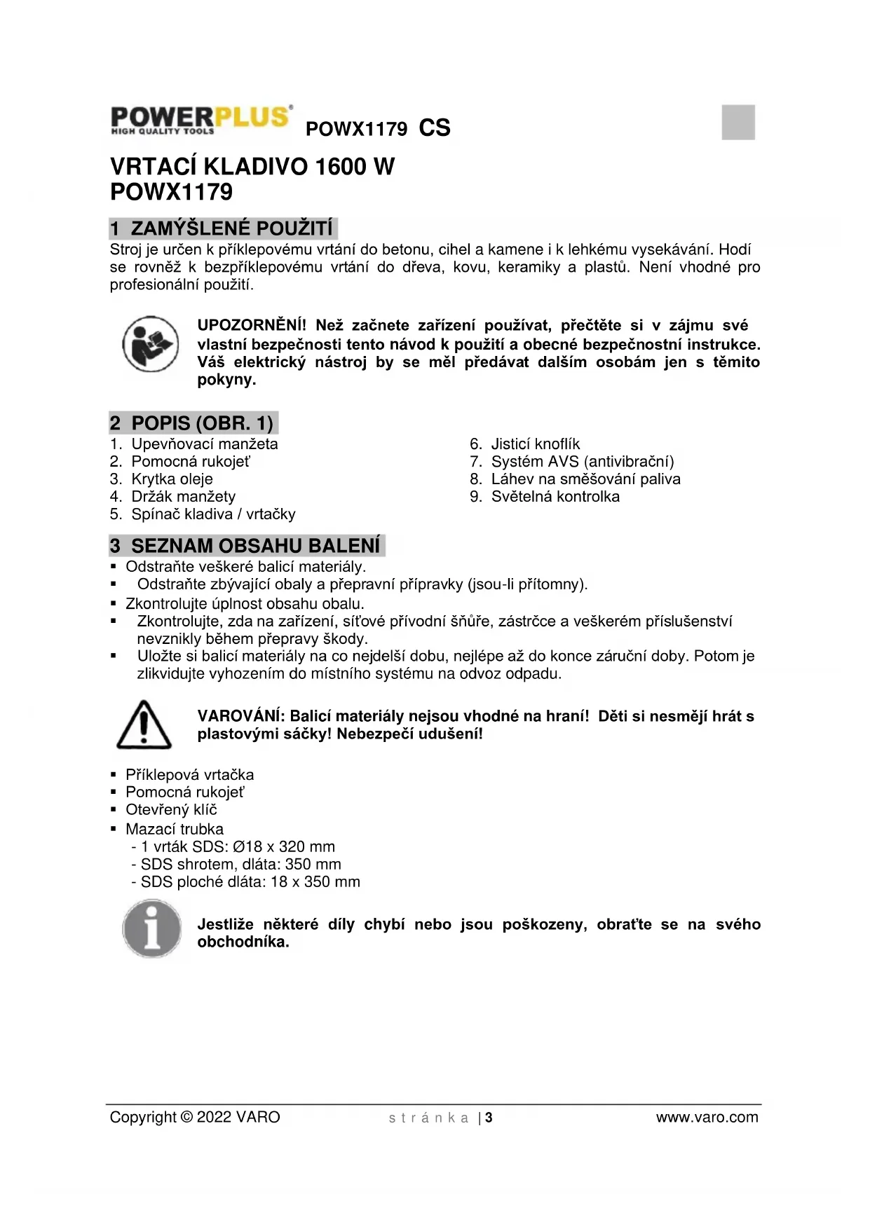 - Mazací trubka - 1 vrták SDS: Ø18 x 320 mm - SDS shrotem, dláta: 350 mm - SDS ploché dláta: 18 x 350 mm Jestliže některé díly chybí nebo jsou poškozeny, obraťte se na svého obchodníka.POWX1179 CS Copyright © 2022 VARO s t r á n k a | 4 www.varo.com 4 SYMBOLY V této příručce a/nebo na stroji se používají následující symboly: