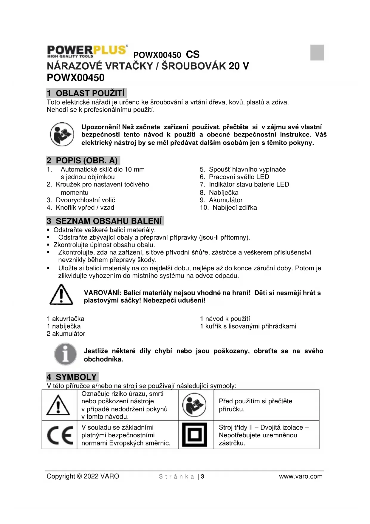 Stroj třídy II – Dvojitá izolace – Nepotřebujete uzemněnou zástrčku.POWX00450 CS Copyright © 2022 VARO S t r á n k a | 4 www.varo.com