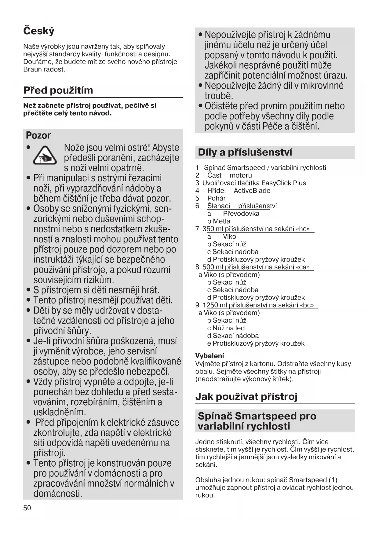 Očistěte před prvním použitím nebo podle potřeby všechny díly podle pokynů v části Péče a čištění. Díly a příslušenství 1 Spínač Smartspeed / variabilní rychlosti 2 Část motoru 3 Uvolňovací tlačítka EasyClick Plus 4 Hřídel ActiveBlade 5 Pohár 6 Šlehací příslušenství a Převodovka b Metla 7 350 ml příslušenství na sekání «hc» a Víko b Sekací nůž c Sekací nádoba d Protiskluzový pryžový kroužek 8 500 ml příslušenství na sekání «ca» a Víko (s převodem) b Sekací nůž c Sekací nádoba d Protiskluzový pryžový kroužek 9 1250 ml příslušenství na sekání «bc» a Víko (s převodem) b Sekací nůž c Nůž na led d Sekací nádoba e Protiskluzový pryžový kroužek Vybalení Vyjměte přístroj z kartonu. Odstraňte všechny kusy obalu. Sejměte všechny štítky na přístroji (neodstraňujte výkonový štítek). Jak používat přístroj Spínač Smartspeed pro variabilní rychlosti Jedno stisknutí, všechny rychlosti. Čím více stisknete, tím vyšší je rychlost. Čím vyšší je rychlost, tím rychlejší a jemnější jsou výsledky mixování a sekání. Obsluha jednou rukou: spínač Smartspeed (1) umožňuje zapnout přístroj a ovládat rychlost jednou rukou. 5722113444_01_MQ 7000x_7045x_INT_S6-96.indd 505722113444_01_MQ 7000x_7045x_INT_S6-96.indd 50 04.07.19 13:5404.07.19 13:5451 Hřídel ActiveBlade (A) Ruční mixér je opatřený hřídelem ActiveBlade, který umožňuje vysunout nůž do spodní části zvonu. Nastavení se provádí automaticky tlakem potřebným při mixování, hodí se zvláště k mixování tvrdých potravin, např. syrového ovoce a zeleniny. Rovněž se skvěle hodí k přípravě dipů, omáček, salátových dresinků, polévek, kojenecké stravy a také nápojů, smoothies a mléčných koktejlů. Pro nejlepší výsledky používejte nejvyšší rychlost. Sestavení a obsluha