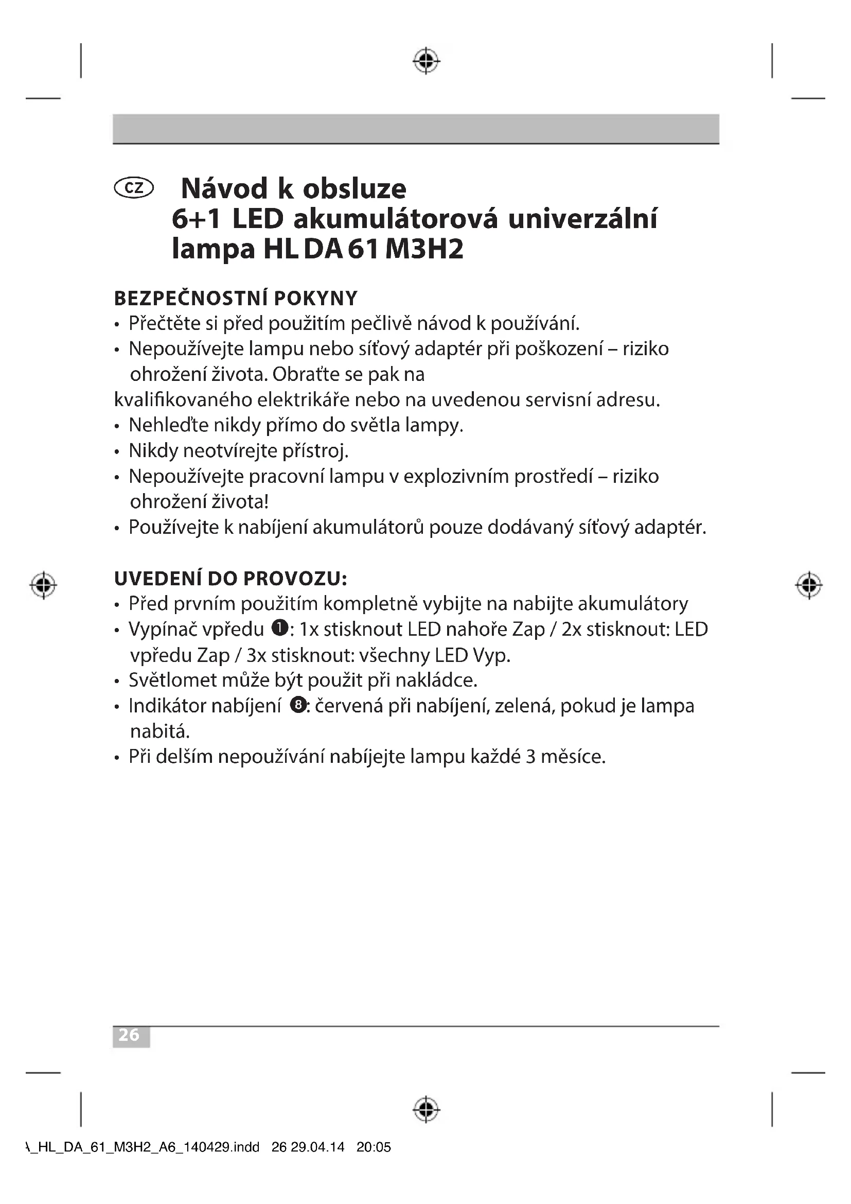 - Při delším nepoužívání nabíjejte lampu každé 3měsíce. BA_HL_DA_61_M3H2_A6_140429.indd 26 29.04.14 20:0527