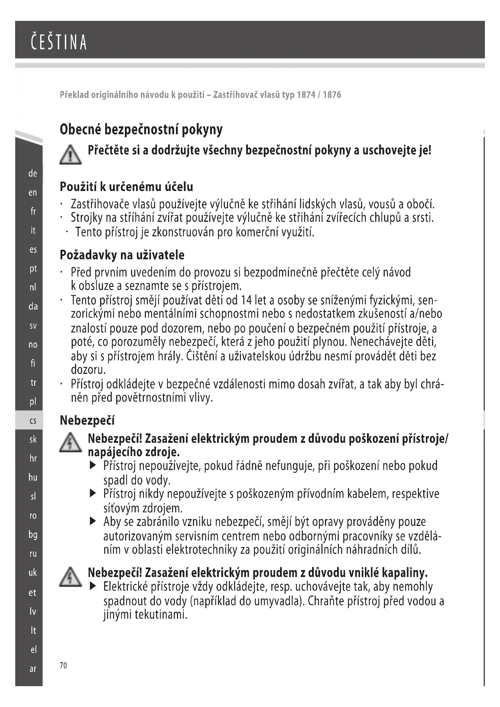 - Přístroj odkládejte v bezpečné vzdálenosti mimo dosah zvířat, a tak aby byl chrá- něn před povětrnostními vlivy. Nebezpečí Nebezpečí! Zasažení elektrickým proudem zdůvodu poškození přístroje/ napájecího zdroje. f Přístroj nepoužívejte, pokud řádně nefunguje, při poškození nebo pokud spadl do vody. f Přístroj nikdy nepoužívejte spoškozeným přívodním kabelem, respektive síťovým zdrojem. f Aby se zabránilo vzniku nebezpečí, smějí být opravy prováděny pouze autorizovaným servisním centrem nebo odbornými pracovníky se vzdělá- ním v oblasti elektrotechniky za použití originálních náhradních dílů. Nebezpečí! Zasažení elektrickým proudem zdůvodu vniklé kapaliny. f Elektrické přístroje vždy odkládejte, resp. uchovávejte tak, aby nemohly spadnout do vody (například do umyvadla). Chraňte přístroj před vodou a jinými tekutinami. Překlad originálního návodu k použití – Zastřihovač vlasů typ 1874 / 187671 ČEŠTINA