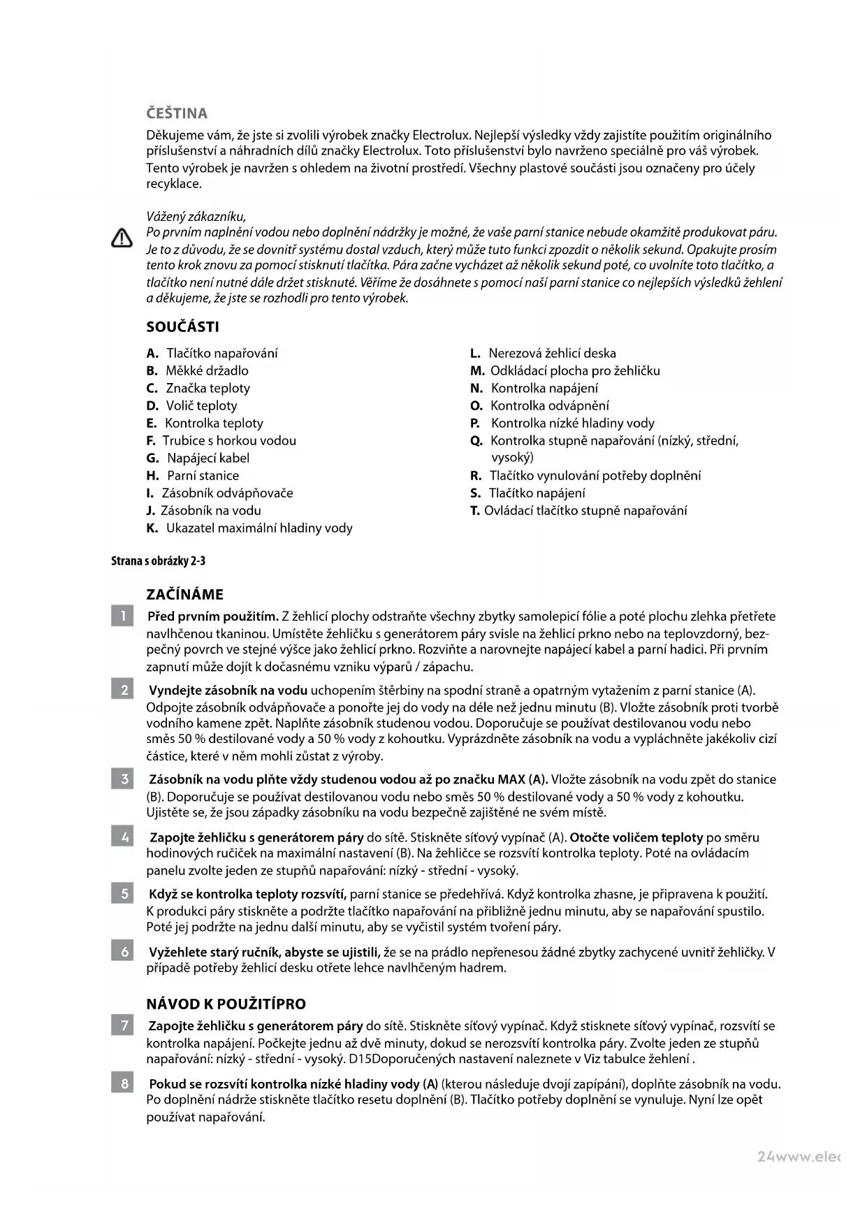 Този символ върху продукта показва, че продуктът съдържа батерия, която не трябва да бъде изхвърляна заедно с обикновените битови отпадъци. Този символ върху продукта или неговата опаковка показва, че продуктът не може да се третира като битов отпадък. За да рециклирате продукта, занесете го в официален пункт за събиране или в сервизен център на Electrolux, който може да отстрани и рециклира батерията и електрическите компоненти по безопасен и професионален начин. Следвайте правилата на Вашата страна относно разделното събиране на електрически продукти и акумулаторни батерии. Electrolux си запазва правото да променя продукти, информация и спецификации без предизвестие24www.electrolux.com ČEŠTINA Děkujeme vám, že jste si zvolili výrobek značky Electrolux. Nejlepší výsledky vždy zajistíte použitím originálního příslušenství a náhradních dílů značky Electrolux. Toto příslušenství bylo navrženo speciálně pro váš výrobek. Tento výrobek je navržen s ohledem na životní prostředí. Všechny plastové součásti jsou označeny pro účely recyklace. Vážený zákazníku, Po prvním naplnění vodou nebo doplnění nádržky je možné, že vaše parní stanice nebude okamžitě produkovat páru. Je to z důvodu, že se dovnitř systému dostal vzduch, který může tuto funkci zpozdit o několik sekund. Opakujte prosím tento krok znovu za pomocí stisknutí tlačítka. Pára začne vycházet až několik sekund poté, co uvolníte toto tlačítko, a tlačítko není nutné dále držet stisknuté. Věříme že dosáhnete s pomocí naší parní stanice co nejlepších výsledků žehlení a děkujeme, že jste se rozhodli pro tento výrobek. SOUČÁSTI A. Tlačítko napařování B. Měkké držadlo C. Značka teploty D. Volič teploty E. Kontrolka teploty F. Trubice s horkou vodou G. Napájecí kabel H. Parní stanice І. Zásobník odvápňovače J. Zásobník na vodu K. Ukazatel maximální hladiny vody L. Nerezová žehlicí deska M. Odkládací plocha pro žehličku N. Kontrolka napájení O. Kontrolka odvápnění P. Kontrolka nízké hladiny vody Q. Kontrolka stupně napařování (nízký, střední, vysoký) R. Tlačítko vynulování potřeby doplnění S. Tlačítko napájení T. Ovládací tlačítko stupně napařování Strana s obrázky 2-3