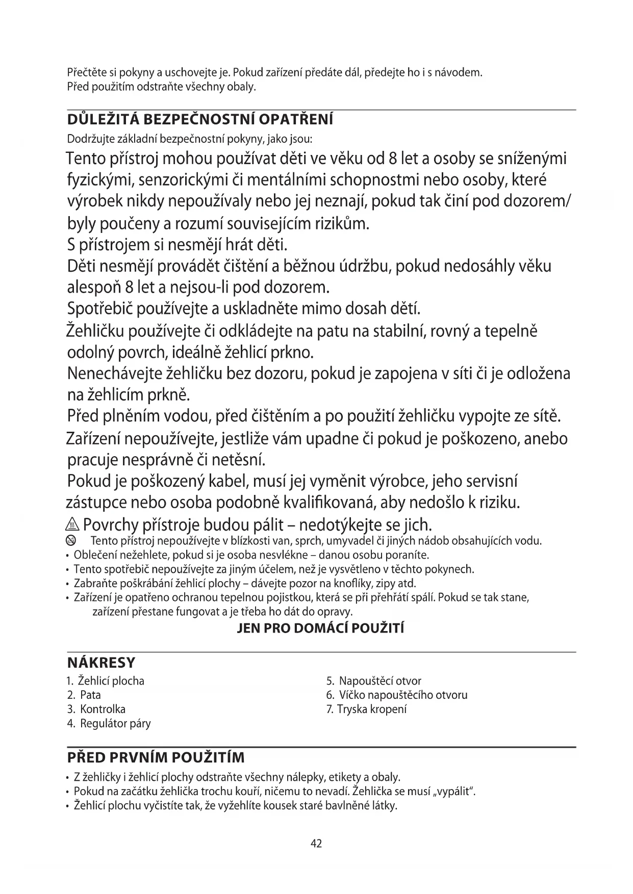 Во избежание воздействия вредных веществ на окружающую среду и здоровье приборы и батареи одноразового или многоразового использования, помеченные одним из этих символов, необходимо утилизировать отдельно от несортированных бытовых отходов. Обязательно утилизируйте электрические и электронные изделия, а также (если это применимо) батареи одноразового или многоразового использования в соответствующих официальных пунктах повторной переработки/сбора отходов.42 Přečtěte si pokyny a uschovejte je. Pokud zařízení předáte dál, předejte ho i s návodem. Před použitím odstraňte všechny obaly. DŮLEŽITÁ BEZPEČNOSTNÍ OPATŘENÍ Dodržujte základní bezpečnostní pokyny, jako jsou: Tento přístroj mohou používat děti ve věku od 8 let a osoby se sníženými fyzickými, senzorickými či mentálními schopnostmi nebo osoby, které výrobek nikdy nepoužívaly nebo jej neznají, pokud tak činí pod dozorem/ byly poučeny a rozumí souvisejícím rizikům. S přístrojem si nesmějí hrát děti. Děti nesmějí provádět čištění a běžnou údržbu, pokud nedosáhly věku alespoň 8 let a nejsou-li pod dozorem. Spotřebič používejte a uskladněte mimo dosah dětí. Žehličku používejte či odkládejte na patu na stabilní, rovný a tepelně odolný povrch, ideálně žehlicí prkno. Nenechávejte žehličku bez dozoru, pokud je zapojena v síti či je odložena na žehlicím prkně. Před plněním vodou, před čištěním a po použití žehličku vypojte ze sítě. Zařízení nepoužívejte, jestliže vám upadne či pokud je poškozeno, anebo pracuje nesprávně či netěsní. Pokud je poškozený kabel, musí jej vyměnit výrobce, jeho servisní zástupce nebo osoba podobně kvalikovaná, aby nedošlo k riziku. h Povrchy přístroje budou pálit – nedotýkejte se jich. b Tento přístroj nepoužívejte v blízkosti van, sprch, umyvadel či jiných nádob obsahujících vodu.