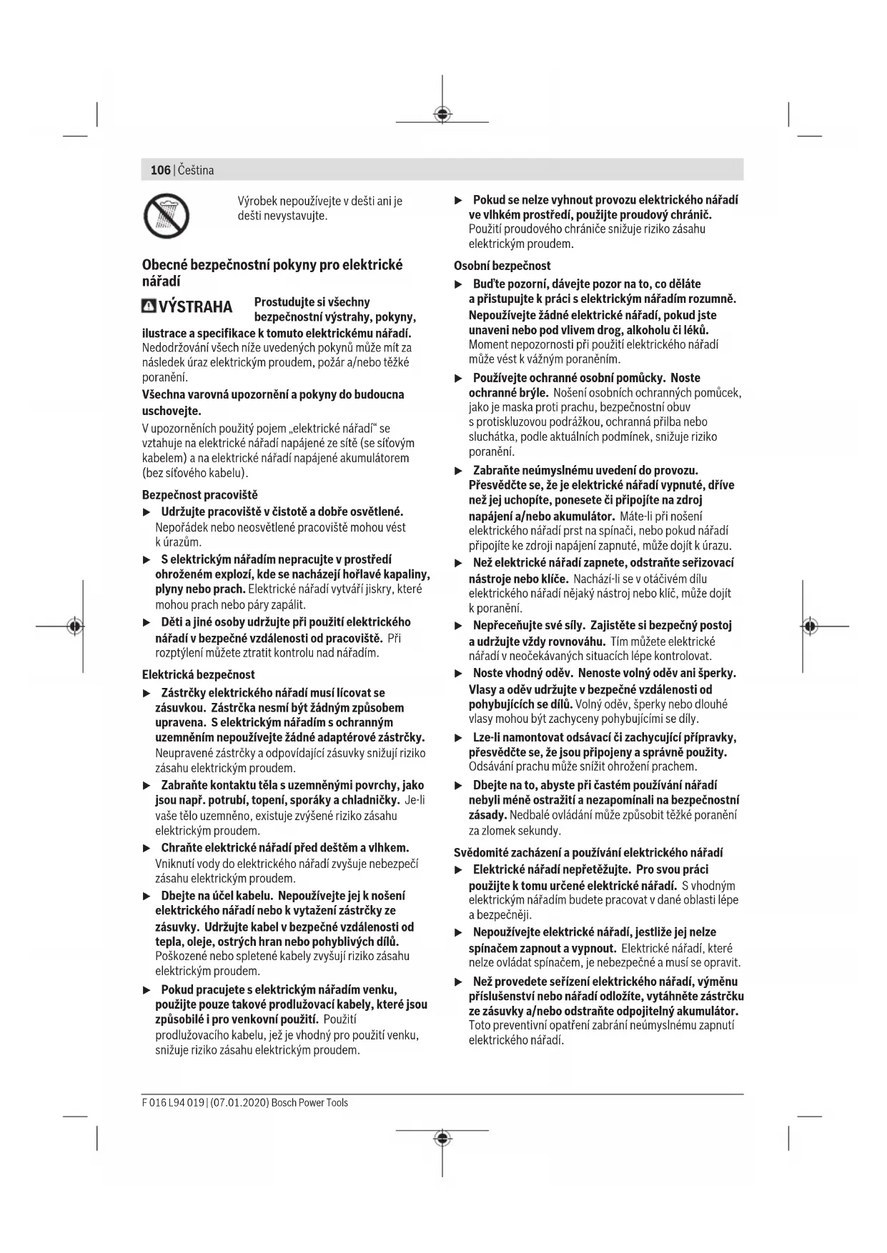 Úroveň vibrací aúroveň hluku, které jsou uvedené vtěchto pokynech, byly změřeny pomocí normované měřicí metody alze je použít pro vzájemné porovnání elektronářadí. Hodí se ipro předběžný odhad zatížení vibracemi ahlukem. Uvedená úroveň vibrací aúroveň hluku reprezentuje hlavní použití elektronářadí. Pokud se ovšem bude elektronářadí používat pro jiné práce, sjinými nástroji nebo snedostatečnou údržbou, může se úroveň hluku aúroveň Bosch Power Tools F 016 L94 019 | (07.01.2020)110 | Čeština vibrací lišit. To může zatížení vibracemi ahlukem po celou pracovní dobu zřetelně zvýšit. Pro přesný odhad zatížení vibracemi ahlukem by měly být zohledněny idoby, kdy je nářadí vypnuté nebo běží, ale ve skutečnosti se nepoužívá. To může zatížení vibracemi ahlukem po celou pracovní dobu výrazně snížit. Stanovte dodatečná bezpečnostní opatření kochraně obsluhy před účinky vibrací, jako je např. údržba elektronářadí anástrojů, udržování teplých rukou, organizace pracovních procesů. Uvedení do provozu u Používejte pouze nabíječky uvedené vtechnických datech. Pouze tyto nabíječky jsou sladěné s akumulátory Li-ion použitými u Vašeho výrobku. Nabíjení akumulátoru (vizobrázek A) Upozornění: Akumulátor se dodává částečně nabitý. Aby byl zaručen plný výkonu akumulátoru, před prvním použitím jej plně nabijte. Akumulátor Li‑ion lze bez zkrácení životnosti kdykoli nabít. Přerušení procesu nabíjení akumulátoru neškodí. Akumulátor Li-ion je chráněný proti hlubokému vybití. Pokud je akumulátor vybitý, podpora síly stříhání se vypne a stroj lze nadále používat v manuálním režimu pro všechny průměry střihu. Akumulátor by se měl dobít, pokud ukazatel stavu nabití akumulátoru (7) během stříhání krátce červeně zabliká. Proces nabíjení začíná, jakmile se zastrčí síťová zástrčka nabíječky do zásuvky a micro USB zástrčka (9) do micro USB zdířky (5) nahoře na rukojeti. Micro USB zdířka (5) je přístupná, když se odjistí bezpečnostní zámek (6). Ukazatel stavu nabití akumulátoru (7) ukazuje postup nabíjení. Při procesu nabíjení bliká ukazatel pomalu zeleně. Svítí-li ukazatel stavu nabití akumulátoru trvale zeleně, pak je akumulátor plně nabitý. Během procesu nabíjení se zahřívá rukojeť nářadí. To je normální. Pokud je proces nabíjení ukončený, odpojte nabíječku od elektrické sítě. u Chraňte nabíječku před vlhkem! Dodržujte pokyny pro likvidaci. Ukazatel stavu nabití akumulátoru Ukazatel stavu nabití(7) indikuje stav nabití akumulátoru. LED Kapacita Trvalé světlo zelené ≥35% Blikající světlo zelené 5 − 35% Jednotlivý záblesk, červený 0 − 5% Upozornění k nabíjení Před používáním stroj nabijte. Ukazatel stavu nabití akumulátoru bliká červeně, pokud: – je nabíječka poškozená – je připojená nesprávná nabíječka Stroj je vybavený ochranou proti přetížení. Pokud zapůsobí ochrana proti přetížení, stroj se zablokuje, aby se zabránilo poškozením. Pro vynulování ochrany proti přetížení připojte nabíječku. Před opětovným použitím stroj plně nabijte, až ukazatel stavu nabití akumulátoru svítí trvale zeleně. Provoz Odjištění (viz obrázek B1) Deaktivujte bezpečnostní zámek (6) posunutím dozadu. Nářadí se otevře a je nyní připraveno k použití. Zajištění Po používání stiskněte rukojeti dohromady a zajistěte bezpečnostní zámek (6) posunutím dopředu. Zahradní nůžky při nepoužívání vždy zajistěte. Poloha uchopení (vizobrázek B2–B4) Držte zahradní nářadí v přední oblasti, jak je zobrazeno. Zahradní nářadí nedržte v zadní oblasti rukojetí nebo prstem (prsty) mezi rukojeťmi. Silou podporované stříhání (vizobrázek B) Zahradní nářadí podporuje obsluhu při stříhání. Používá se jako běžné zahradní nůžky a stříhá v manuálním režimu bez silové podpory dokud není překročen určitý průměr větvičky. Při větších průměrech větví zapne integrovaný motor podporu síly. Vznik hluku při silou podporovaném stříhání je normální. Silová podpora pracuje jen dokud působí síla na rukojeti. Bez tlaku na rukojeti se zahradní nářadí zastaví. Pracovní pokyny Tipy pro stříhání houští (vizobrázek C1–C10) Stroj neovládejte v nepříznivém postoji. To může vést k těžkým poraněním. Držte svou volnou ruku v bezpečné vzdálenosti vůči pracovní oblasti. Nedotýkejte se čepelí. Čepele jsou velmi ostré a můžete se o ně říznout.