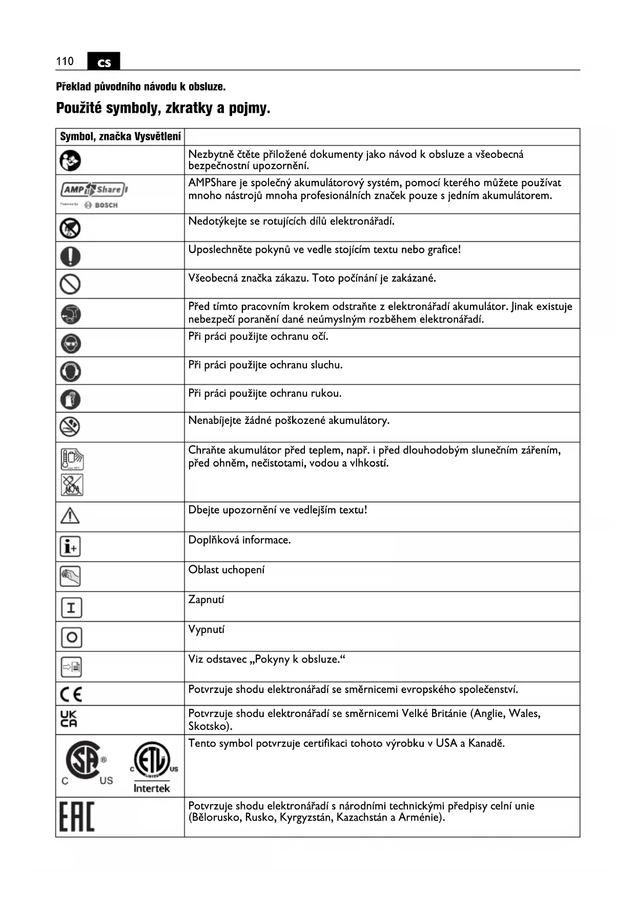 Překlad původního návodu k obsluze. Použité symboly, zkratky a pojmy. Symbol, značka Vysvětlení Nezbytně čtěte přiložené dokumenty jako návod k obsluze a všeobecná bezpečnostní upozornění. AMPShare je společný akumulátorový systém, pomocí kterého můžete používat mnoho nástrojů mnoha profesionálních značek pouze s jedním akumulátorem. Nedotýkejte se rotujících dílů elektronářadí. Uposlechněte pokynů ve vedle stojícím textu nebo grafice! Všeobecná značka zákazu. Toto počínání je zakázané. Před tímto pracovním krokem odstraňte z elektronářadí akumulátor. Jinak existuje nebezpečí poranění dané neúmyslným rozběhem elektronářadí. Při práci použijte ochranu očí. Při práci použijte ochranu sluchu. Při práci použijte ochranu rukou. Nenabíjejte žádné poškozené akumulátory. Chraňte akumulátor před teplem, např. i před dlouhodobým slunečním zářením, před ohněm, nečistotami, vodou a vlhkostí. Dbejte upozornění ve vedlejším textu! Doplňková informace. Oblast uchopení Zapnutí Vypnutí Viz odstavec „Pokyny k obsluze.“ Potvrzuje shodu elektronářadí se směrnicemi evropského společenství. Potvrzuje shodu elektronářadí se směrnicemi Velké Británie (Anglie, Wales, Skotsko). Tento symbol potvrzuje certifikaci tohoto výrobku v USA a Kanadě. Potvrzuje shodu elektronářadí s národními technickými předpisy celní unie (Bělorusko, Rusko, Kyrgyzstán, Kazachstán a Arménie). max.50°C111