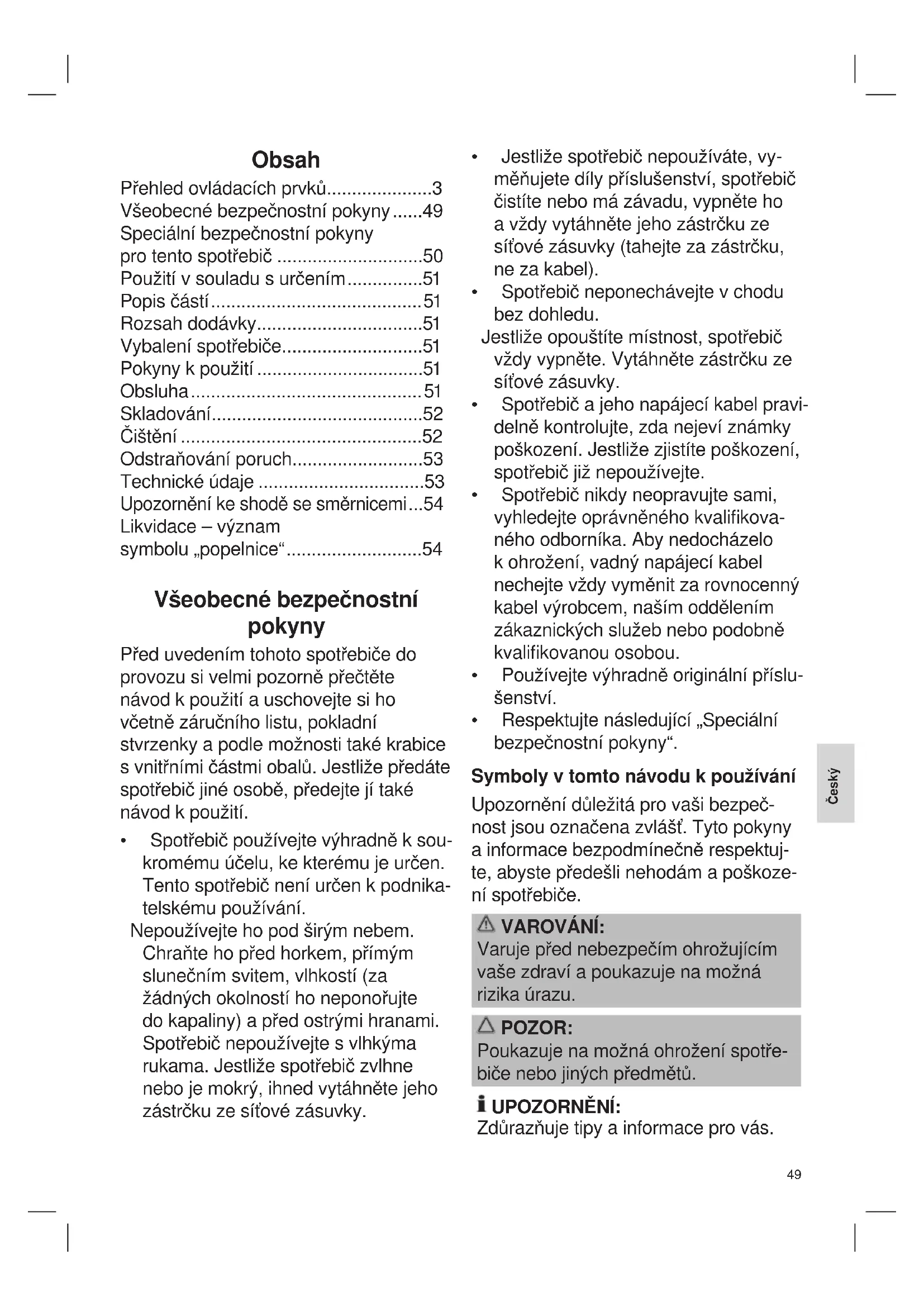 Likvidace – význam symbolu „popelnice“ ...........................54 Všeobecné bezpečnostní pokyny Před uvedením tohoto spotřebiče do provozu si velmi pozorně přečtěte návod k použití a uschovejte si ho včetně záručního listu, pokladní stvrzenky a podle možnosti také krabice s vnitřními částmi obalů. Jestliže předáte spotřebič jiné osobě, předejte jí také návod k použití.
