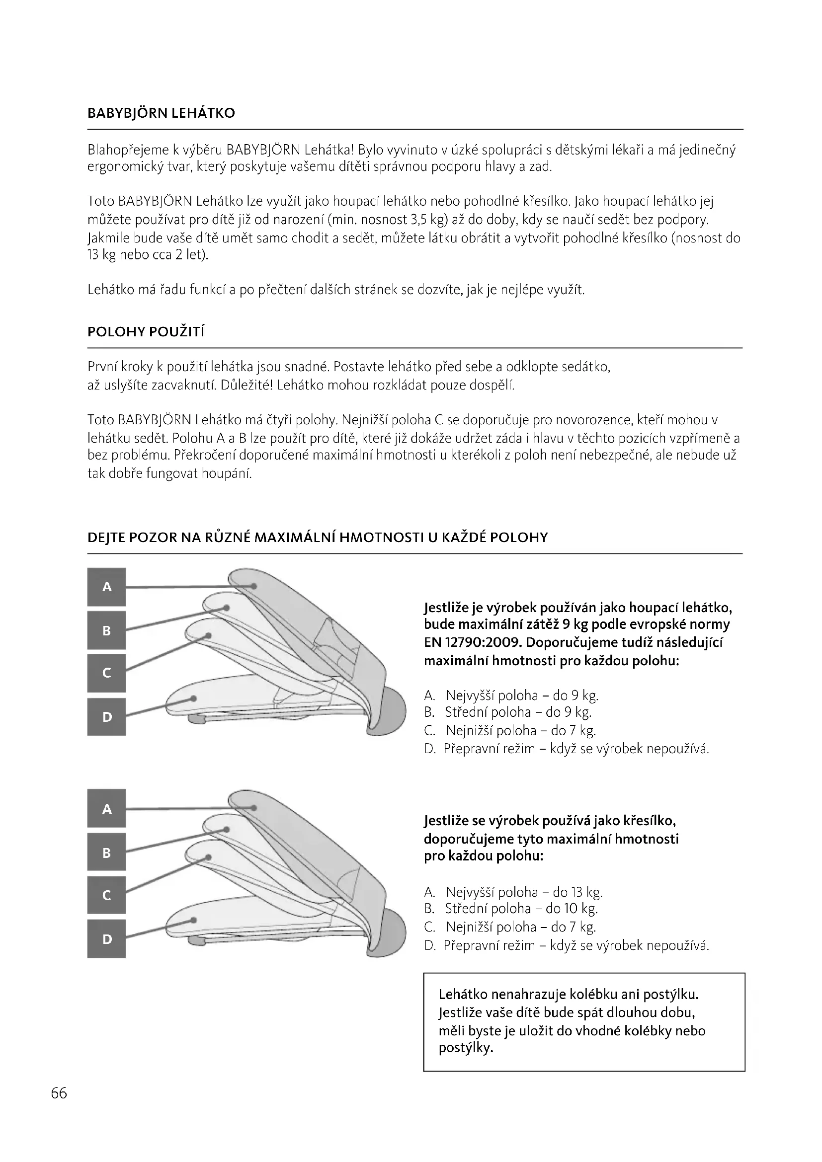 Blahopřejeme k výběru BABYBJÖRN Lehátka! Bylo vyvinuto v úzké spolupráci s dětskými lékaři amá jedinečný ergonomický tvar, který poskytuje vašemu dítěti správnou podporu hlavy a zad. Toto BABYBJÖRN Lehátko lze využít jako houpací lehátko nebo pohodlné křesílko. Jako houpací lehátko jej můžete používat pro dítě již od narození (min. nosnost 3,5 kg) až do doby, kdy se naučí sedět bez podpory. Jakmile bude vaše dítě umět samo chodit a sedět, můžete látku obrátit a vytvořit pohodlné křesílko (nosnost do 13 kg nebo cca 2 let). Lehátko má řadu funkcí a po přečtení dalších stránek se dozvíte, jak je nejlépe využít. Jestliže je výrobek používán jako houpací lehátko, bude maximální zátěž 9 kg podle evropské normy EN 12790:2009. Doporučujeme tudíž následující maximální hmotnosti pro každou polohu: A. Nejvyšší poloha – do 9 kg. B. Střední poloha – do 9 kg. C. Nejnižší poloha – do 7 kg. D. Přepravní režim – když se výrobek nepoužívá. DEJTE POZOR NA RŮZNÉ MAXIMÁLNÍ HMOTNOSTI U KAŽDÉ POLOHY Jestliže se výrobek používá jako křesílko, doporučujeme tyto maximální hmotnosti pro každou polohu: A. Nejvyšší poloha – do 13 kg. B. Střední poloha – do 10 kg. C. Nejnižší poloha – do 7 kg. D. Přepravní režim – když se výrobek nepoužívá.