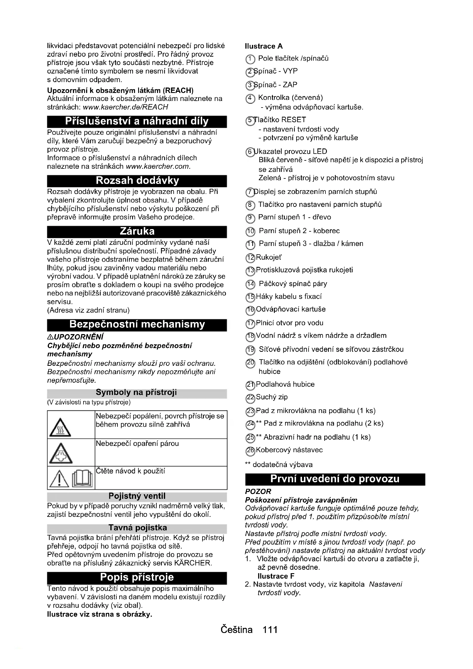 - Technické údaje Čeština 111 likvidaci představovat potenciální nebezpečí pro lidské zdraví nebo pro životní prostředí. Pro řádný provoz přístroje jsou však tyto součásti nezbytné. Přístroje označené tímto symbolem se nesmí likvidovat s domovním odpadem. Upozornění k obsaženým látkám (REACH) Aktuální informace k obsaženým látkám naleznete na stránkách: www.kaercher.de/REACH Příslušenství a náhradní díly Používejte pouze originální příslušenství a náhradní díly, které Vám zaručují bezpečný a bezporuchový provoz přístroje. Informace o příslušenství a náhradních dílech naleznete na stránkách www.kaercher.com. Rozsah dodávky Rozsah dodávky přístroje je vyobrazen na obalu. Při vybalení zkontrolujte úplnost obsahu. V případě chybějícího příslušenství nebo výskytu poškození při přepravě informujte prosím Vašeho prodejce. Záruka V každé zemi platí záruční podmínky vydané naší příslušnou distribuční společností. Případné závady vašeho přístroje odstraníme bezplatně během záruční lhůty, pokud jsou zaviněny vadou materiálu nebo výrobní vadou. V případě uplatnění nároků ze záruky se prosím obraťte s dokladem o koupi na svého prodejce nebo na nejbližší autorizované pracoviště zákaznického servisu. (Adresa viz zadní stranu) Bezpečnostní mechanismy 몇 UPOZORNĚNÍ Chybějící nebo pozměněné bezpečnostní mechanismy Bezpečnostní mechanismy slouží pro vaši ochranu. Bezpečnostní mechanismy nikdy nepozměňujte ani nepřemosťujte. Symboly na přístroji (V závislosti na typu přístroje) Pojistný ventil Pokud by v případě poruchy vznikl nadměrně velký tlak, zajistí bezpečnostní ventil jeho vypuštění do okolí. Tavná pojistka Tavná pojistka brání přehřátí přístroje. Když se přístroj přehřeje, odpojí ho tavná pojistka od sítě. Před opětovným uvedením přístroje do provozu se obraťte na příslušný zákaznický servis KÄRCHER. Popis přístroje Tento návod k použití obsahuje popis maximálního vybavení. V závislosti na daném modelu existují rozdíly v rozsahu dodávky (viz obal). Ilustrace viz strana s obrázky. Ilustrace A 1 Pole tlačítek /spínačů 2 Spínač - VYP 3 Spínač - ZAP 4 Kontrolka (červená) - výměna odvápňovací kartuše. 5 Tlačítko RESET - nastavení tvrdosti vody - potvrzení po výměně kartuše 6 Ukazatel provozu LED Bliká červeně - síťové napětí je k dispozici a přístroj se zahřívá Zelená - přístroj je v pohotovostním stavu 7 Displej se zobrazením parních stupňů 8 Tlačítko pro nastavení parních stupňů 9 Parní stupeň 1 - dřevo 10 Parní stupeň 2 - koberec 11 Parní stupeň 3 - dlažba / kámen 12 Rukojeť 13 Protiskluzová pojistka rukojeti 14 Páčkový spínač páry 15 Háky kabelu s fixací 16 Odvápňovací kartuše 17 Plnicí otvor pro vodu 18 Vodní nádrž s víkem nádrže a držadlem 19 Síťové přívodní vedení se síťovou zástrčkou 20 Tlačítko na odjištění (odblokování) podlahové hubice 21 Podlahová hubice 22 Suchý zip 23 Pad z mikrovlákna na podlahu (1 ks) 24 ** Pad z mikrovlákna na podlahu (2 ks) 25 ** Abrazivní hadr na podlahu (1 ks) 26 Kobercový nástavec ** dodatečná výbava První uvedení do provozu POZOR Poškození přístroje zavápněním Odvápňovací kartuše funguje optimálně pouze tehdy, pokud přístroj před 1. použitím přizpůsobíte místní tvrdosti vody. Nastavte přístroj podle místní tvrdosti vody. Před použitím v místě s jinou tvrdostí vody (např. po přestěhování) nastavte přístroj na aktuální tvrdost vody p. 116