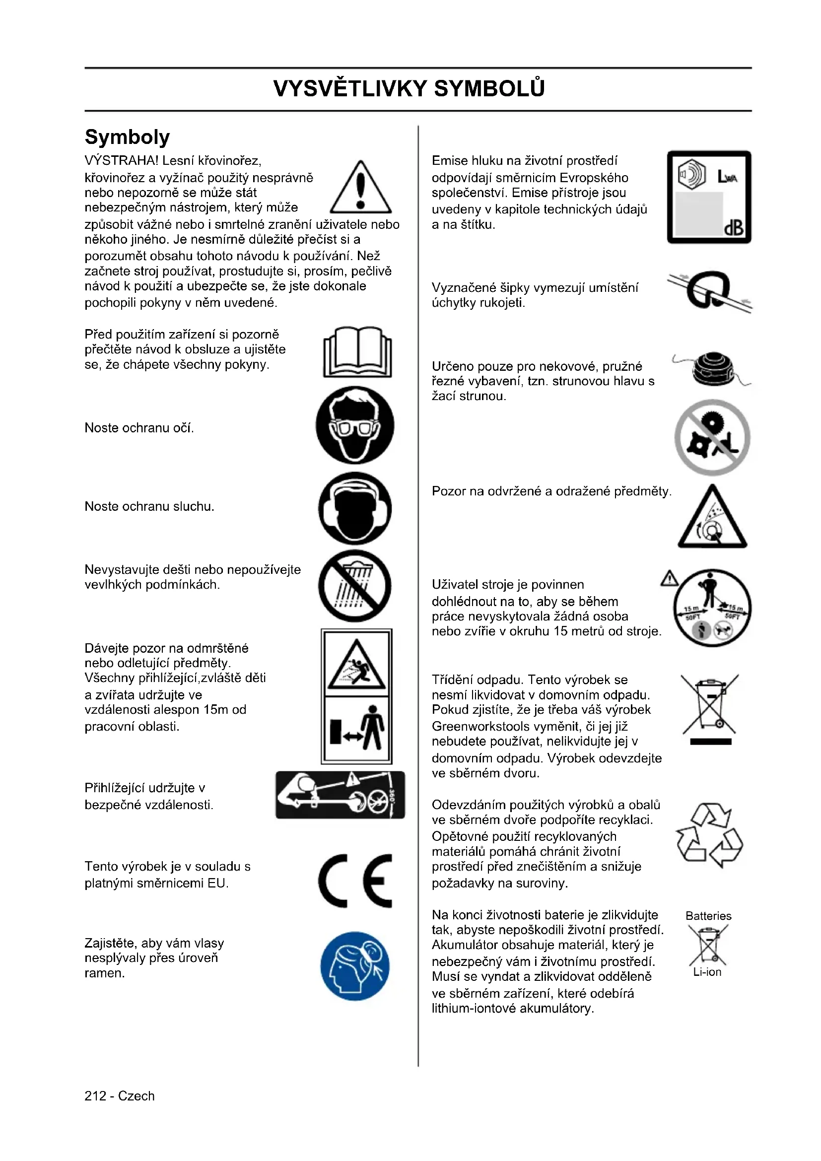 Symboly VÝSTRAHA! Lesní křovinořez, křovinořez a vyžínač použitý nesprávně nebo nepozorně se může stát nebezpečným nástrojem, který může způsobit vážné nebo i smrtelné zranění uživatele nebo někoho jiného. Je nesmírně důležité přečíst si a porozumět obsahu tohoto návodu k používání. Než začnete stroj používat, prostudujte si, prosím, pečlivě návod k použití a ubezpečte se, že jste dokonale pochopili pokyny v něm uvedené. Před použitím zařízení si pozorně přečtěte návod k obsluze a ujistěte se, že chápete všechny pokyny. Noste ochranu očí. Noste ochranu sluchu. Nevystavujte dešti nebo nepoužívejte vevlhkých podmínkách. Dávejte pozor na odmrštěné nebo odletující předměty. Všechny přihlížející,zvláště děti a zvířata udržujte ve vzdálenosti alespon 15m od pracovní oblasti. Přihlížející udržujte v bezpečné vzdálenosti. Tento výrobek je v souladu s platnými směrnicemi EU. Zajistěte, aby vám vlasy nesplývaly přes úroveň ramen. Emise hluku na životní prostředí odpovídají směrnicím Evropského společenství. Emise přístroje jsou uvedeny v kapitole technických údajů a na štítku. Vyznačené šipky vymezují umístění úchytky rukojeti. Určeno pouze pro nekovové, pružné řezné vybavení, tzn. strunovou hlavu s žací strunou. Pozor na odvržené a odražené předměty. Uživatel stroje je povinnen dohlédnout na to, aby se během práce nevyskytovala žádná osoba nebo zvířie v okruhu 15 metrů od stroje. Třídění odpadu. Tento výrobek se nesmí likvidovat v domovním odpadu. Pokud zjistíte, že je třeba váš výrobek Greenworkstools vyměnit, či jej již nebudete používat, nelikvidujte jej v domovním odpadu. Výrobek odevzdejte ve sběrném dvoru. Odevzdáním použitých výrobků a obalů ve sběrném dvoře podpoříte recyklaci. Opětovné použití recyklovaných materiálů pomáhá chránit životní prostředí před znečištěním a snižuje požadavky na suroviny. Na konci životnosti baterie je zlikvidujte tak, abyste nepoškodili životní prostředí. Akumulátor obsahuje materiál, který je nebezpečný vám i životnímu prostředí. Musí se vyndat a zlikvidovat odděleně ve sběrném zařízení, které odebírá lithium-iontové akumulátory. Batteries Li-ion213Czech - Obsah
