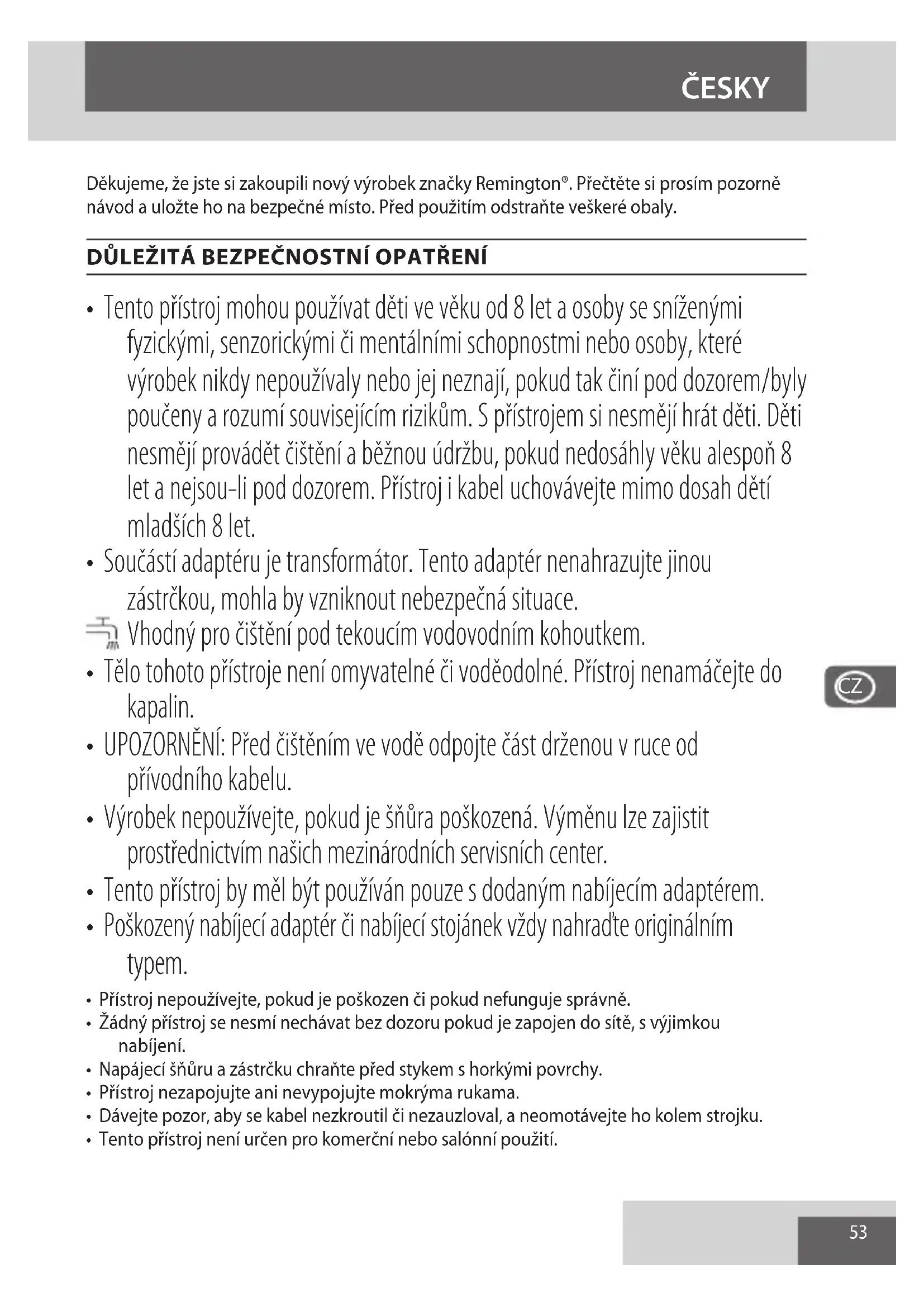 Aby nedocházelo k ničení životního prostředí a zdraví kvůli obsaženým nebezpečným látkám, přístroje a dobíjecí i nedobíjecí baterie označené jedním z těchto symbolů nesmějí být vyhazovány do směsného komunálního odpadu. Elektrické a elektronické výrobky, a pokud to přísluší, i dobíjecí i nedobíjecí baterie, vždy likvidujte na ociálním recyklačním/sběrném místě. ČESKY57 Dziękujemy za zakup nowego produktu Remington®. Przed użyciem zapoznaj się uważnie z instrukcją obsługi i zachowaj ją na przyszłość. Przed użyciem wyjmij z opakowania. WAŻNE WSKAZÓWKI DOTYCZĄCE BEZPIECZEŃSTWA