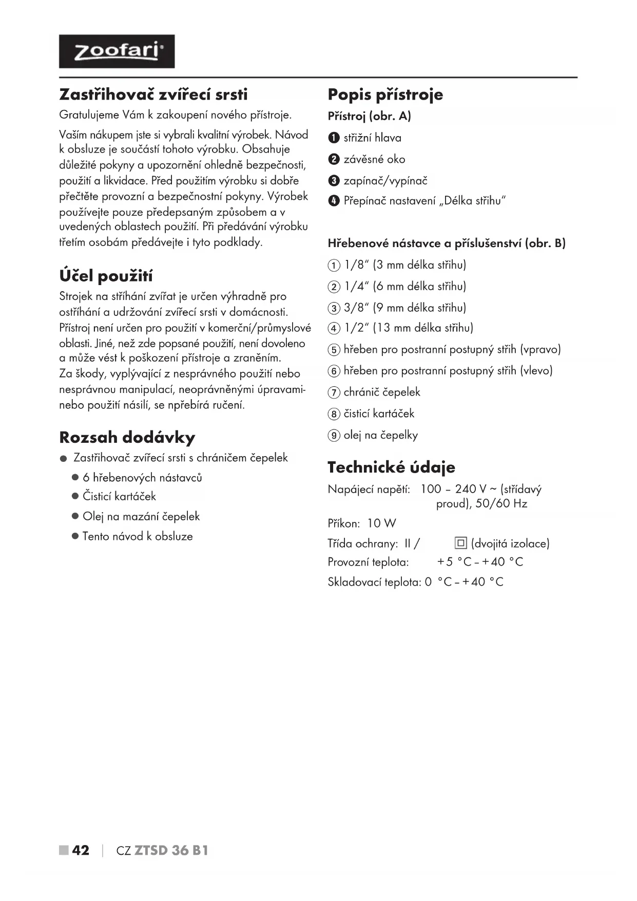 Zastřihovač zvířecí srsti s chráničem čepelek ▯ 6 hřebenových nástavců ▯ Čisticí kartáček ▯ Olej na mazání čepelek ▯ Tento návod k obsluze Popis přístroje Přístroj (obr. A) 1 střižní hlava 2 závěsné oko 3 zapínač/vypínač 4 Přepínač nastavení „Délka střihu“ Hřebenové nástavce a příslušenství (obr. B) 1 1/8“ (3 mm délka střihu) 2 1/4“ (6 mm délka střihu) 3 3/8“ (9 mm délka střihu) 4 1/2“ (13 mm délka střihu) 5 hřeben pro postranní postupný střih (vpravo) 6 hřeben pro postranní postupný střih (vlevo) 7 chránič čepelek 8 čisticí kartáček 9 olej na čepelky Technické údaje Napájecí napětí: 100 – 240 V ∼ (střídavý proud), 50/60 Hz Příkon: 10 W Třída ochrany: II / (dvojitá izolace) Provozní teplota: + 5 °C – + 40 °C Skladovací teplota: 0 °C – + 40 °C IB_315533_ZTSD36B1_LB8.indb 42 22.01.19 12:33CZ