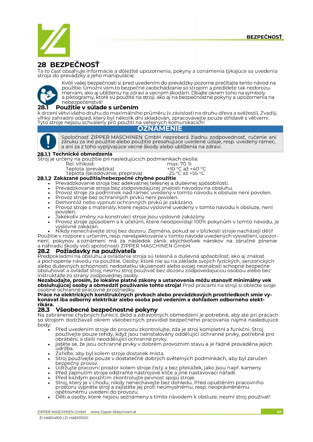 - Děti a osoby, které nejsou seznámeny s tímto návodem k obsluze, nesmí stroj používat!BEZPEČNOSŤ ZIPPER MASCHINEN GmbH www.Zipper-Maschinen.at 63 ZI-HAEK4100 | ZI-HAEK11000