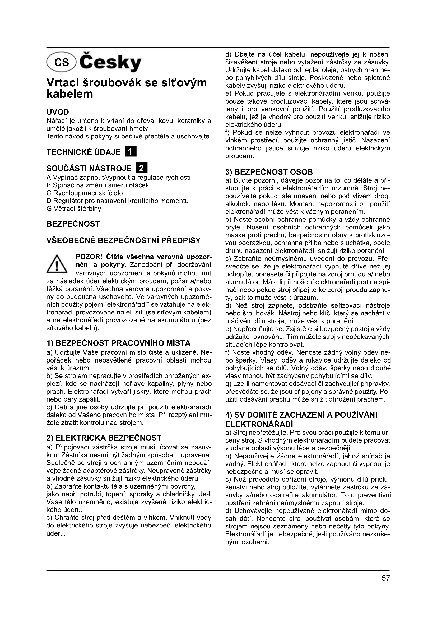 ELEKTRONÁŘADÍ a) Stroj nepĮetěžujte. Pro svou práci použijte k tomu ur- čený stroj. S vhodným elektronáĮadím budete pracovat v udané oblasti výkonu lépe a bezpečněji. b) Nepoužívejte žádné elektronáĮadí, jehož spínač je vadný. ElektronáĮadí, které nelze zapnout či vypnout je nebezpečné a musí se opravit. c) Než provedete seĮízení stroje, výměnu dílů pĮíslu- šenství nebo stroj odložíte, vytáhněte zástrčku ze zá- suvky a/nebo odstraňte akumulátor. Toto preventivní opatĮení zabrání neúmyslnému zapnutí stroje. d) Uchovávejte nepoužívané elektronáĮadí mimo do- sah dětí. Nenechte stroj používat osobám, které se strojem nejsou seznámeny nebo nečetly tyto pokyny. ElektronáĮadí je nebezpečné, je-li používáno nezkuše- nými osobami. Vrtací šroubovák se síovým kabelem ÚVOD NáĮadí je určeno k vrtání do dĮeva, kovu, keramiky a umělé jakož i k šroubování hmoty Tento návod s pokyny si pečlivě pĮečtěte a uschovejte TECHNICKÉ ÚDAJE
