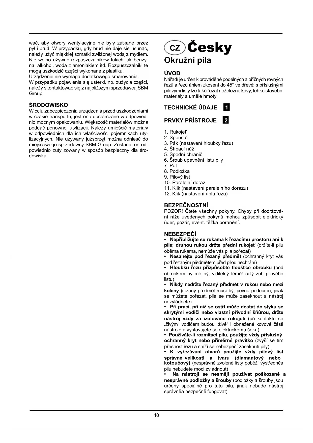 - K vyřezávání otvorů použijte vždy pilový list správné velikosti a tvaru (diamantový nebo kotoučový) (nesprávně zvolené listy poběží výstředněa pilu nebudete moci zvládnout)• Na nástroji se nesmějí používat poškozené a nesprávné podložky a šrouby (podložky a šrouby jsou určeny speciálně pro tuto pilu, jinak nebude nástroj správněa bezpečně fungovat) wać, aby otwory wentylacyjne nie były zatkane przez pył i brud. W przypadku, gdy brud nie daje się usunąć, należy użyć miękkiej szmatki zwilżonej wodą z mydłem. Nie wolno używać rozpuszczalników takich jak benzy- na, alkohol, woda z amoniakiem itd. Rozpuszczalniki te mogą uszkodzić części wykonane z plastiku. Urządzenie nie wymaga dodatkowego smarowania.W przypadku pojawienia się usterki, np. zużycia części, należy skontaktować się z najbliższym sprzedawcą SBM Group. ŚRODOWISKO W celu zabezpieczenia urządzenia przed uszkodzeniami w czasie transportu, jest ono dostarczane w odpowied- nio mocnym opakowaniu. Większość materiałów można poddać ponownej utylizacji. Należy umieścić materiały w odpowiednich dla ich właściwości pojemnikach uty- lizacyjnych. Nie używany jużsprzęt można odnieść do miejscowego sprzedawcy SBM Group. Zostanie on od-powiednio zutylizowany w sposób bezpieczny dla śro-dowiska.41 volně pohybuje a při libovolném úhlu a hloubce řezání se nedotýká ani listu, ani žádné jiné části nástroje