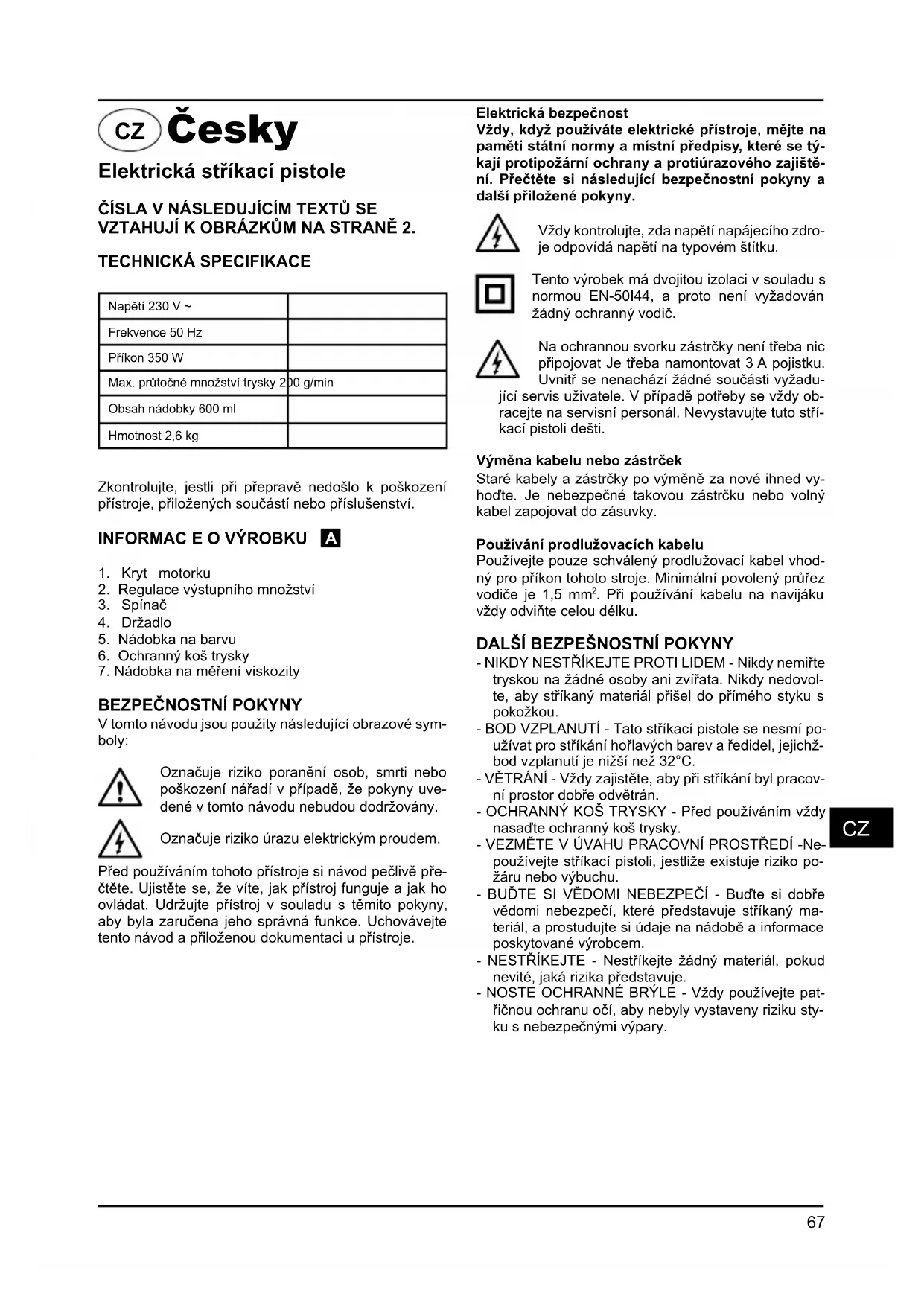 V tomto návodu jsou použity následující obrazové sym-boly: Označuje riziko poranění osob, smrti nebo poškození nářadí v případě, že pokyny uve- dené v tomto návodu nebudou dodržovány.Označuje riziko úrazu elektrickým proudem. Před používáním tohoto přístroje si návod pečlivě pře- čtěte. Ujistěte se, že víte, jak přístroj funguje a jak ho ovládat. Udržujte přístroj v souladu s těmito pokyny, aby byla zaručena jeho správná funkce. Uchovávejte tento návod a přiloženou dokumentaci u přístroje.Elektrická bezpečnostVždy, když používáte elektrické přístroje, mějte na paměti státní normy a místní předpisy, které se tý- kají protipožární ochrany a protiúrazového zajiště- ní. Přečtěte si následující bezpečnostní pokyny a další přiložené pokyny.Vždy kontrolujte, zda napětí napájecího zdro-je odpovídá napětí na typovém štítku.Tento výrobek má dvojitou izolaci v souladu s normou EN-50I44, a proto není vyžadován žádný ochranný vodič.Na ochrannou svorku zástrčky není třeba nic připojovat Je třeba namontovat 3 A pojistku. Uvnitř se nenachází žádné součásti vyžadu- jící servis uživatele. V případě potřeby se vždy ob- racejte na servisní personál. Nevystavujte tuto stří-kací pistoli dešti.Výměna kabelu nebo zástrček Staré kabely a zástrčky po výměně za nové ihned vy- hoďte. Je nebezpečné takovou zástrčku nebo volný kabel zapojovat do zásuvky.Používání prodlužovacích kabeluPoužívejte pouze schválený prodlužovací kabel vhod- ný pro příkon tohoto stroje. Minimální povolený průřez vodiče je 1,5 mm . Při používání kabelu na navijáku vždy odviňte celou délku.