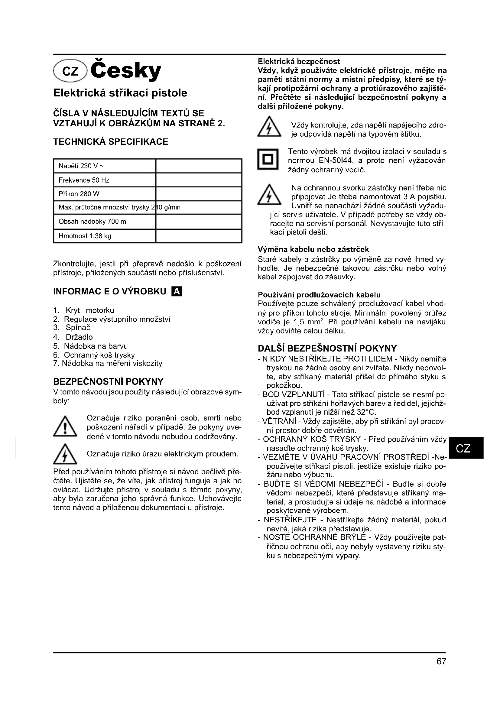V tomto návodu jsou použity následující obrazové sym-boly: Označuje riziko poranění osob, smrti nebo poškození nářadí v případě, že pokyny uve- dené v tomto návodu nebudou dodržovány.Označuje riziko úrazu elektrickým proudem. Před používáním tohoto přístroje si návod pečlivě pře- čtěte. Ujistěte se, že víte, jak přístroj funguje a jak ho ovládat. Udržujte přístroj v souladu s těmito pokyny, aby byla zaručena jeho správná funkce. Uchovávejte tento návod a přiloženou dokumentaci u přístroje.Elektrická bezpečnostVždy, když používáte elektrické přístroje, mějte na paměti státní normy a místní předpisy, které se tý- kají protipožární ochrany a protiúrazového zajiště- ní. Přečtěte si následující bezpečnostní pokyny a další přiložené pokyny.Vždy kontrolujte, zda napětí napájecího zdro-je odpovídá napětí na typovém štítku.Tento výrobek má dvojitou izolaci v souladu s normou EN-50I44, a proto není vyžadován žádný ochranný vodič.Na ochrannou svorku zástrčky není třeba nic připojovat Je třeba namontovat 3 A pojistku. Uvnitř se nenachází žádné součásti vyžadu- jící servis uživatele. V případě potřeby se vždy ob- racejte na servisní personál. Nevystavujte tuto stří-kací pistoli dešti.Výměna kabelu nebo zástrček Staré kabely a zástrčky po výměně za nové ihned vy- hoďte. Je nebezpečné takovou zástrčku nebo volný kabel zapojovat do zásuvky.Používání prodlužovacích kabeluPoužívejte pouze schválený prodlužovací kabel vhod- ný pro příkon tohoto stroje. Minimální povolený průřez vodiče je 1,5 mm . Při používání kabelu na navijáku vždy odviňte celou délku.