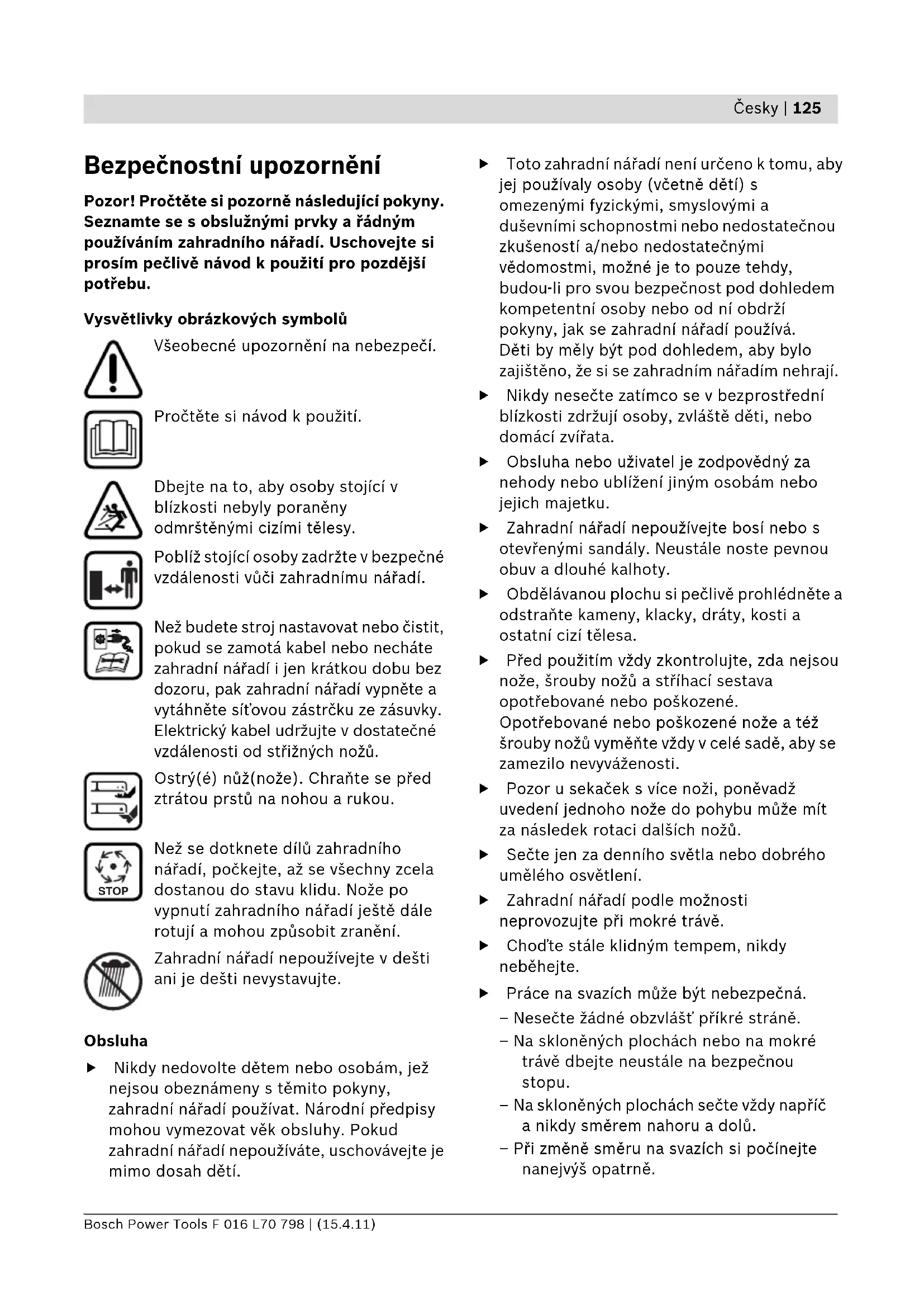 Bezpečnostní upozornění Pozor! Pročtěte si pozorně následující pokyny. Seznamte se s obslužnými prvky a řádným používáním zahradního nářadí. Uschovejte si prosím pečlivě návod k použití pro pozdější potřebu. Vysvětlivky obrázkových symbolů Všeobecné upozornění na nebezpečí. Pročtěte si návod k použití. Dbejte na to, aby osoby stojící v blízkosti nebyly poraněny odmrštěnými cizími tělesy. Poblíž stojící osoby zadržte v bezpečné vzdálenosti vůči zahradnímu nářadí. Než budete stroj nastavovat nebo čistit, pokud se zamotá kabel nebo necháte zahradní nářadí i jen krátkou dobu bez dozoru, pak zahradní nářadí vypněte a vytáhněte síťovou zástrčku ze zásuvky. Elektrický kabel udržujte v dostatečné vzdálenosti od střižných nožů. Ostrý(é) nůž(nože). Chraňte se před ztrátou prstů na nohou a rukou. Než se dotknete dílů zahradního nářadí, počkejte, až se všechny zcela dostanou do stavu klidu. Nože po vypnutí zahradního nářadí ještě dále rotují a mohou způsobit zranění. Zahradní nářadí nepoužívejte v dešti ani je dešti nevystavujte. Obsluha f Nikdy nedovolte dětem nebo osobám, jež nejsou obeznámeny s těmito pokyny, zahradní nářadí používat. Národní předpisy mohou vymezovat věk obsluhy. Pokud zahradní nářadí nepoužíváte, uschovávejte je mimo dosah dětí. f Toto zahradní nářadí není určeno k tomu, aby jej používaly osoby (včetně dětí) s omezenými fyzickými, smyslovými a duševními schopnostmi nebo nedostatečnou zkušeností a/nebo nedostatečnými vědomostmi, možné je to pouze tehdy, budou-li pro svou bezpečnost pod dohledem kompetentní osoby nebo od ní obdrží pokyny, jak se zahradní nářadí používá. Děti by měly být pod dohledem, aby bylo zajištěno, že si se zahradním nářadím nehrají. f Nikdy nesečte zatímco se v bezprostřední blízkosti zdržují osoby, zvláště děti, nebo domácí zvířata. f Obsluha nebo uživatel je zodpovědný za nehody nebo ublížení jiným osobám nebo jejich majetku. f Zahradní nářadí nepoužívejte bosí nebo s otevřenými sandály. Neustále noste pevnou obuv a dlouhé kalhoty. f Obdělávanou plochu si pečlivě prohlédněte a odstraňte kameny, klacky, dráty, kosti a ostatní cizí tělesa. f Před použitím vždy zkontrolujte, zda nejsou nože, šrouby nožů a stříhací sestava opotřebované nebo poškozené. Opotřebované nebo poškozené nože a též šrouby nožů vyměňte vždy v celé sadě, aby se zamezilo nevyváženosti. f Pozor u sekaček s více noži, poněvadž uvedení jednoho nože do pohybu může mít za následek rotaci dalších nožů. f Sečte jen za denního světla nebo dobrého umělého osvětlení. f Zahradní nářadí podle možnosti neprovozujte při mokré trávě. f Choďte stále klidným tempem, nikdy neběhejte. f Práce na svazích může být nebezpečná. – Nesečte žádné obzvlášť příkré stráně. – Na skloněných plochách nebo na mokré trávě dbejte neustále na bezpečnou stopu. – Na skloněných plochách sečte vždy napříč a nikdy směrem nahoru a dolů. – Při změně směru na svazích si počínejte nanejvýš opatrně. STOP OBJ_BUCH-1393-001.book Page 125 Friday, April 15, 2011 10:36 AM126 | Česky F 016 L70 798 | (15.4.11) Bosch Power Tools – Při chůzi pozpátku nebo při tažení zahradního nářadí si počínejte nanejvýš opatrně. – Zahradní nářadí posunujte při sečení vždy kupředu a nikdy ho netáhněte k tělu. f Pokud musíte zahradní nářadí kvůli přepravě naklopit, když přejíždíte nezatravněné plochy nebo když přepravujete zahradní nářadí k sečené a od sečené oblasti, pak musí nože stát. f Zahradní nářadí při zapnutí nebo rozběhu motoru nenaklánějte, ledaže je to potřeba ke startu ve vysoké trávě. V tom případě nadzdvihněte jen tolik, jak je nezbytně nutné, od obsluhy odvrácenou stranu stlačením rukojeti dolů. Když zahradní nářadí zase spouštíte dolů, dbejte na to, aby se Vaše ruce nacházely na rukojeti. f Zahradní nářadí zapněte jak je popsáno v návodu k obsluze a dbejte na to, aby byly Vaše nohy vzdáleny dostatečně daleko od rotujících dílů. f Nedávejte své ruce a nohy do blízkosti nebo pod rotující díly. f Když pracujete se zahradním nářadím, udržujte odstup vůči chrlící zóně. f Nikdy nezvedejte resp. nenoste zahradní nářadí s běžícím motorem. f Nikdy neprovozujte zahradní nářadí s vadnými ochrannými přípravky, kryty nebo bez bezpečnostních zařízení, jako např. bez ochrany proti odmrštění a/nebo bez sběrného koše na trávu. f Při seřizovacích pracech na sekačce si počínejte krajně opatrně, aby se zabránilo přiskřípnutí rukou a nohou mezi pohyblivými noži a nepohyblivými díly sekačky. f Udržujte přívodní a prodlužovací kabel v dostatečné vzdálenosti od nožů. Nůž může kabely poškodit a Vy se dostanete do kontaktu s díly pod napětím. Pozor, existuje nebezpečí zásahu elektrickým proudem. Síťovou zástrčku vytáhněte ze zásuvky: – když se od zahradního nářadí vzdálíte, – před odstraněním zablokování, – když zahradní nářadí kontrolujete, čistíte nebo na něm pracujete, – po kolizi s cizím tělesem. Ihned zkontrolujte poškození zahradního nářadí a, pokud je to nutné, nechte jej opravit, – když zahradní nářadí začne nezvykle vibrovat (okamžitě zkontrolujte). Připojení do sítě f Napětí zdroje proudu musí souhlasit s údaji na typovém štítku zahradního nářadí. f Je doporučeno toto zahradní nářadí připojovat pouze na zásuvku, jež je jištěna chráničem s vybavovacím proudem 30 mA. f Používejte pouze takové elektrické připojovací kabely nebo nahraďte na zahradním nářadí jen takovými, jež odpovídají údajům vý