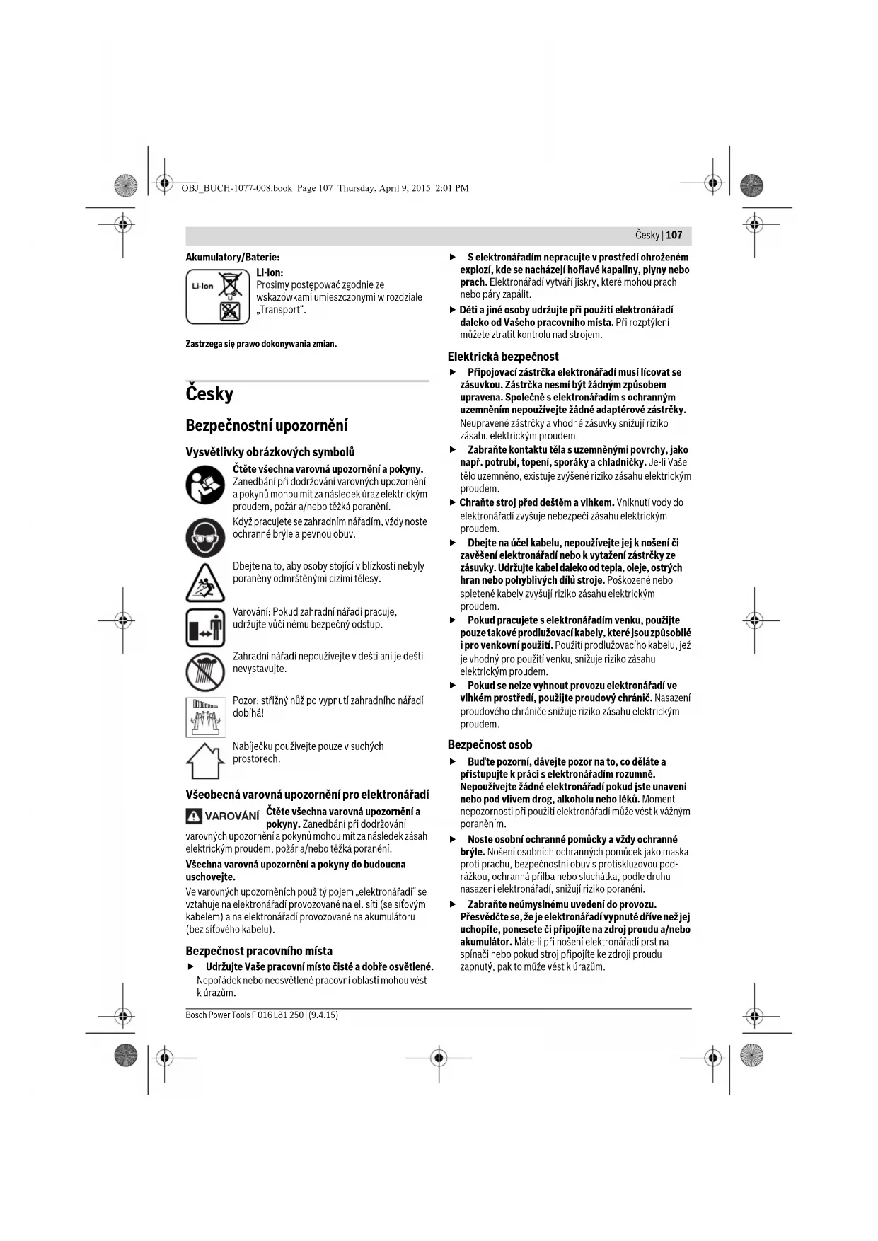 Wskaźnik LED Pojemność Światło ciągłe zielone 35 – 100% Zielone migające światło 15 – 35% Czerwone migające światło 5 –15% Czerwone światło ciągłe 0 –5% OBJ_BUCH-1077-008.book Page 105 Thursday, April 9, 2015 2:01 PM106 | Polski F 016 L81 250 | (9.4.15) Bosch Power Tools Lokalizacja usterek Konserwacja i czyszczenie Uwaga! Narzędzie ogrodowe należy wyłączyć przed przystąpieniem do jego konserwacji lub czyszczenia. Po wyłączeniu narzędzia ogrodowego noże tnące pracują jeszcze przez parę sekund. Uwaga! Nie wolno dotykać obracających się noży. Utrzymywanie narzędzia ogrodowego w czystości gwarantuje prawidłową i bezpieczną pracę. Podczas pracy z narzędziem ogrodowym, a także podczas prac konserwacyjnych i pielęgnacyjnych przy narzędziu, należy zawsze nosić rękawice ochronne. Regularnie kontrolować narzędzie ogrodowe pod kątem oczywistych usterek, takich jak luźne połączenia i zużyte lub uszkodzone elementy konstrukcyjne. Obsługa klienta oraz doradztwo dotyczące użytkowania www.bosch-garden.com Przy wszystkich zgłoszeniach oraz zamówieniach części zamiennych konieczne jest podanie 10-cyfrowego numeru katalogowego elektronarzędzia zgodnie z danymi na tabliczce znamionowej. Polska Robert Bosch Sp. z o.o. Serwis Elektronarzędzi Ul. Szyszkowa 35/37 02-285 Warszawa Na www.bosch-pt.pl znajdą Państwo wszystkie szczegóły dotyczące usług serwisowych online. Tel.: 22 7154460 Faks: 22 7154441 E-Mail: bsc@pl.bosch.com Infolinia Działu Elektronarzędzi: 801 100900 (w cenie połączenia lokalnego) E-Mail: elektronarzedzia.info@pl.bosch.com www.bosch.pl Transport Załączone w dostawie akumulatory litowo jonowe podlegają wymaganiom przepisów dotyczących towarów niebezpiecznych. Akumulatory mogą być transportowane drogą lądową przez użytkownika bez konieczności spełnienia jakichkolwiek dalszych warunków. W przypadku przesyłki przez osoby trzecie (np. transport drogą powietrzną lub za pośrednictwem firmy spedycyjnej) należy dostosować się do szczególnych wymogów dotyczących opakowania i znaczenia towaru. W takim wypadku podczas przygotowywania towaru do wysyłki należy skonsultować się z ekspertem d/s towarów niebezpiecznych. Usuwanie odpadów Narzędzia ogrodowe, osprzęt i opakowanie należy oddać do powtórnego przetworzenia zgodnego z obowiązującymi przepisami w zakresie ochrony środowiska. Narzędzi ogrodowych, ładowarek, a także akumulatorów/ baterii nie wolno wyrzucać do odpadów z gospodarstwa domowego! Tylko dla państw należących do UE: Zgodnie z europejską wytyczną 2012/19/UE, niezdatne do użytku elektronarzędzia i urządzenia elektroniczne, a zgodnie z europejską wytyczną 2006/66/WE uszkodzone lub zużyte akumulatory/baterie, należy zbierać osobno i doprowadzić do ponownego przetworzenia zgodnego z zasadami ochrony środowiska. Wbudowane akumulatory wolno wyjmować wyłącznie w celu utylizacji. Otwieranie obudowy może spowodować uszkodzenie narzędzia ogrodowego. Aby wyjąć akumulator z elektronarzędzia, należy wielokrotnie uruchamiać włącznik/wyłącznik , aby spowodować całkowite wyładowanie się akumulatora. Wykręcić śruby z obudowy i zdjąć skorupę obudowy, aby wyjąć akumulator. Aby uniknąć zwarcia wewnętrznego akumulatora, jego przyłącza należy oddzielnie odłączać, izolując po kolei wszystkie bieguny. Także w przypadku całkowitego wyładowania, w akumulatorze znajduje się tzw. „pozostała pojemność“, która może doprowadzić do zwarcia. Symptomy Możliwa przyczyna Usunięcie usterki Zbyt krótki czas pracy na jedno ładowanie akumulatora Kończy się żywotność akumulatora. Zwrócić się do punktu serwisowego Wskaźnik ładowania akumulatora świeci się światłem ciągłym Nie jest możliwe ładowanie Akumulator jest uszkodzony Zwrócić się do punktu serwisowego OBJ_BUCH-1077-008.book Page 106 Thursday, April 9, 2015 2:01 PMČesky | 107 Bosch Power Tools F 016 L81 250 | (9.4.15) Akumulatory/Baterie: Li-Ion: Prosimy postępować zgodnie ze wskazówkami umieszczonymi w rozdziale „Transport“. Zastrzega się prawo dokonywania zmian. Česky Bezpečnostní upozornění Vysvětlivky obrázkových symbolů Čtěte všechna varovná upozornění a pokyny. Zanedbání při dodržování varovných upozornění a pokynů mohou mít za následek úraz elektrickým proudem, požár a/nebo těžká poranění. Když pracujete se zahradním nářadím, vždy noste ochranné brýle a pevnou obuv. Dbejte na to, aby osoby stojící v blízkosti nebyly poraněny odmrštěnými cizími tělesy. Varování: Pokud zahradní nářadí pracuje, udržujte vůči němu bezpečný odstup. Zahradní nářadí nepoužívejte v dešti ani je dešti nevystavujte. Pozor: střižný nůž po vypnutí zahradního nářadí dobíhá! Nabíječku používejte pouze v suchých prostorech. Všeobecná varovná upozornění pro elektronářadí Čtěte všechna varovná upozornění a pokyny. Zanedbání při dodržování varovných upozornění a pokynů mohou mít za následek zásah elektrickým proudem, požár a/nebo těžká poranění. Všechna varovná upozornění a pokyny do budoucna uschovejte. Ve varovných upozorněních použitý pojem „elektronářadí“ se vztahuje na elektronářadí provozované na el. síti (se síťovým kabelem) a na elektronářadí provozované na akumulátoru (bez síťového kabelu). Bezpečnost pracovního místa Udržujte Vaše pracovní místo čisté a dobře osvětlené. Nepořádek nebo neosvětlené pracovní oblasti mohou vést k úrazům. S elektronářadím nepracujte v prostředí ohroženém explozí, kde se nacházejí hořlavé kapaliny, plyny nebo prach. Elektronářadí vytváří jiskry, které mohou prach nebo páry zapálit. Děti a jiné osoby udržujte při použití elektronářadí daleko od Vašeho pracovního místa. Při rozptýlení můžete ztratit kontrolu nad strojem. Elektrická bezp
