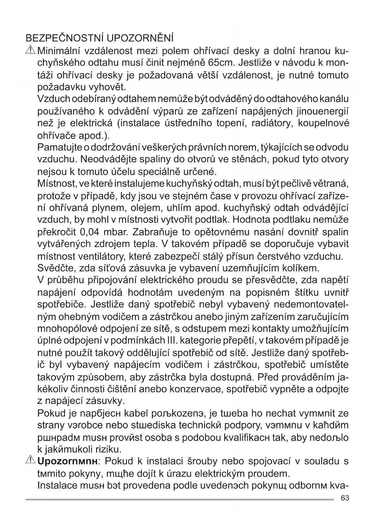 Minimální vzdálenost mezi polem ohřívací desky a dolní hranou ku- chyňského odtahu musí činit nejméně 65cm. Jestliže v návodu k mon- táži ohřívací desky je požadovaná větší vzdálenost, je nutné tomuto požadavku vyhovět. Vzduch odebíraný odtahem nemůže být odváděný do odtahového kanálu používaného k odvádění výparů ze zařízení napájených jinouenergií než je elektrická (instalace ústředního topení, radiátory, koupelnové ohřívače apod.). Pamatujte o dodržování veškerých právních norem, týkajících se odvodu vzduchu. Neodvádějte spaliny do otvorů ve stěnách, pokud tyto otvory nejsou k tomuto účelu speciálně určené. Místnost, ve které instalujeme kuchyňský odtah, musí být pečlivě v ětraná, protože v případě, kdy jsou ve stejném čase v provozu ohřívací zaříze- ní ohřívaná plynem, olejem, uhlím apod. kuchyňský odtah odvádějící vzduch, by mohl v místnosti vytvořit podtlak. Hodnota podtlaku nemůže překročit 0,04 mbar. Zabraňuje to opětovnému nasání dovnitř spalin vytvářených zdrojem tepla. V takovém případě se doporučuje vybavit místnost ventilátory, které zabezpečí stálý přísun čerstvého vzduchu. Svědčte, zda síťová zásuvka je vybavení uzemňujícím kolíkem. V průběhu připojování elektrického proudu se přesvědčte, zda napětí napájení odpovídá hodnotám uvedeným na popisném štítku uvnitř spotřebiče. Jestliže daný spotřebič nebyl vybavený nedemontovatel- ným ohebným vodičem a zástrčkou anebo jiným zařízením zaručujícím mnohopólové odpojení ze sítě, s odstupem mezi kontakty umožňujícím úplné odpojení v podmínkách III. kategorie přepětí, v takovém případě je nutné použít takový oddělující spotřebič od sítě. Jestliže daný spotřeb- ič byl vybavený napájecím vodičem i zástrčkou, spotřebič umístěte takovým způsobem, aby zástrčka byla dostupná. Před prováděním ja- kékoliv činnosti čištění anebo konzervace, spotřebič vypněte a odpojte z napájecí zásuvky. Pokud je napбjecн kabel poљkozenэ, je tшeba ho nechat vymмnit ze strany vэrobce nebo stшediska technickй podpory, vэmмnu v kaћdйm pшнpadм musн provйst osoba s podobou kvalifi kacн tak, aby nedoљlo k jakйmukoli riziku. Upozornмnн: Pokud k instalaci šrouby nebo spojovací v souladu s tмmito pokyny, mщћe dojít k úrazu elektrickým proudem. Instalace musн bэt provedena podle uvedenэch pokynщ odbornм kva-64 POUŽITÍ FILTRUJНCН NEBO SACН? Digestoш mщћe bэt buп ve verzi sacн nebo fi ltrujнcн. Typ si zvolte jeљtм pшed instalacн. Doporuиujeme instalovat digestoш sacн verze (pokud je to moћnй), protoћe mб vyљљн ъиinno- st. Sacн verze Digestoш иistн vzduch a odvбdн ven vэfukovou trubkou. Filtraиnн verze Digestoш иistн vzduch a vracн jej иistэ zpмt do mнstnosti. lifi kovanэm personбlem. Vyhýbejte se používání snadno zápalných materiálů poblíž spotřebiče. Při přípravě pokrmů nedopusťte do přeskočení plamene na kuchyňský odtah. V případě smažení na pánvi věnujte pozornost tomu, aby se olej anebo tuk nezapálil. Mimořádně je nebezpečný olej, z důvodu své snadné zápalnosti. Nepoužívejte otevřené elektrické rošty. Pro vyhnutí se možnému požárnímu ohrožení vždy dodržujte pokyny návodu k obsluze, týkající se čištění tukových fi ltrů a odstraňování eventuálních tukových usazenin v spotřebiči. Spotřebič m ůže být používaný osobami se sníženými fyzickými, senzori- ckými nebo mentálními schopnostmi, nebo bez dostatečných zkušeností a znalostí, pod podmínkou, že tyto osoby se nacházejí pod kontrolou, obdržely návod k obsluze a chápou ohrožení spojená s obsluhou. Nedovolte dětem hrát si se spotřebičem. Čištění a konzervace, jejichž provedení je ve vlastní režii uživatele, nemůže být prováděné dětmi bez dozoru. Pozor: dostupné části kuchy ňských odtahů mohou být horké, pokud jsou používané s jinými kuchyňskými spotřebiči. Tento kuchyňský odtah může být používaný pouze v domácnosti a je určený k instalaci nad kuchyňkami, vařiči a podobnými spotřebiči.
