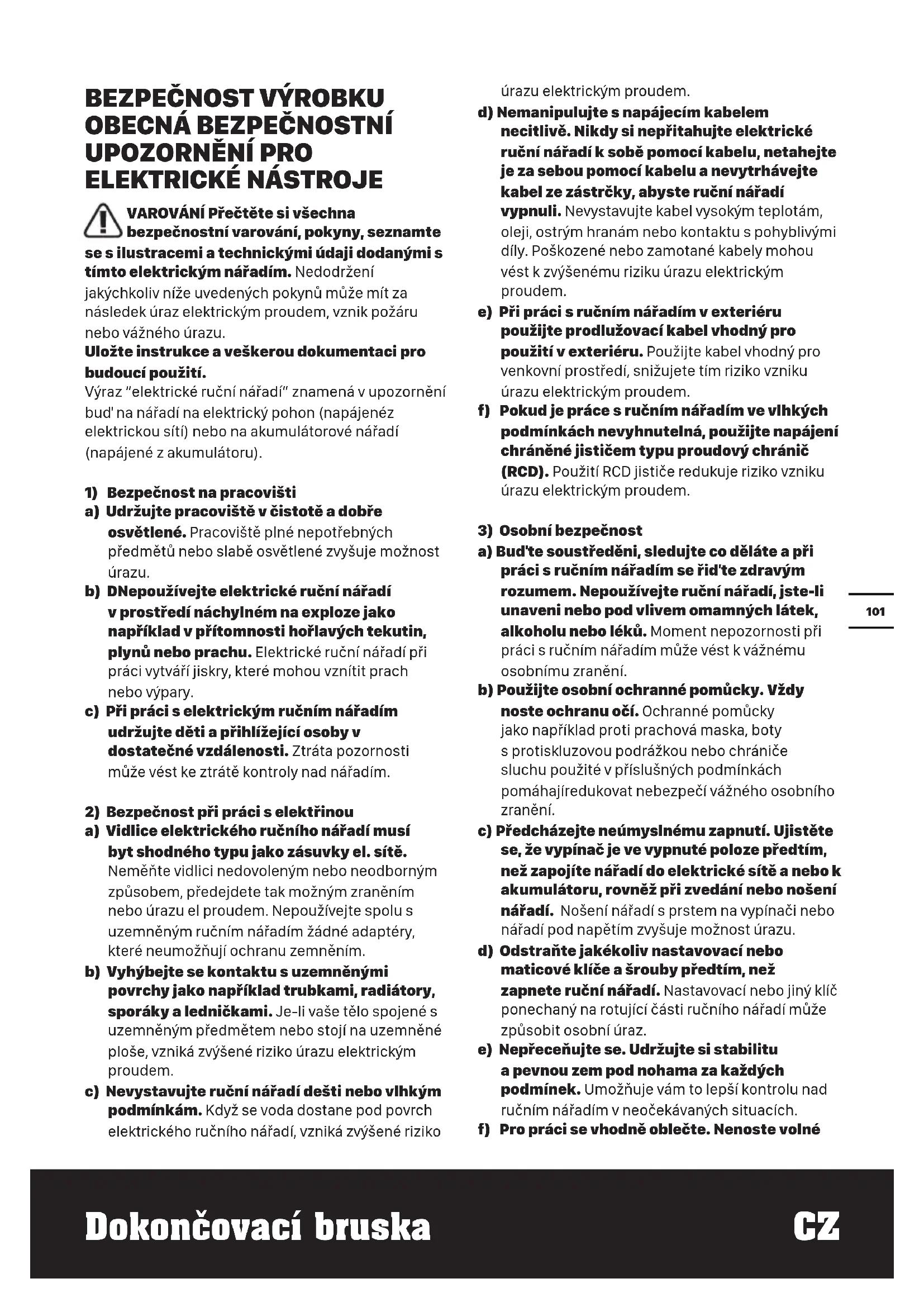 VAROVÁNÍ Přečtěte si všechna bezpečnostní varování, pokyny, seznamte se s ilustracemi a technickými údaji dodanými s tímto elektrickým nářadím. Nedodržení jakýchkoliv níže uvedených pokynů může mít za následek úraz elektrickým proudem, vznik požáru nebo vážného úrazu. Uložte instrukce a veškerou dokumentaci pro budoucí použití. Výraz “elektrické ruční nářadí” znamená v upozornění buď na nářadí na elektrický pohon (napájenéz elektrickou sítí) nebo na akumulátorové nářadí (napájené z akumulátoru).