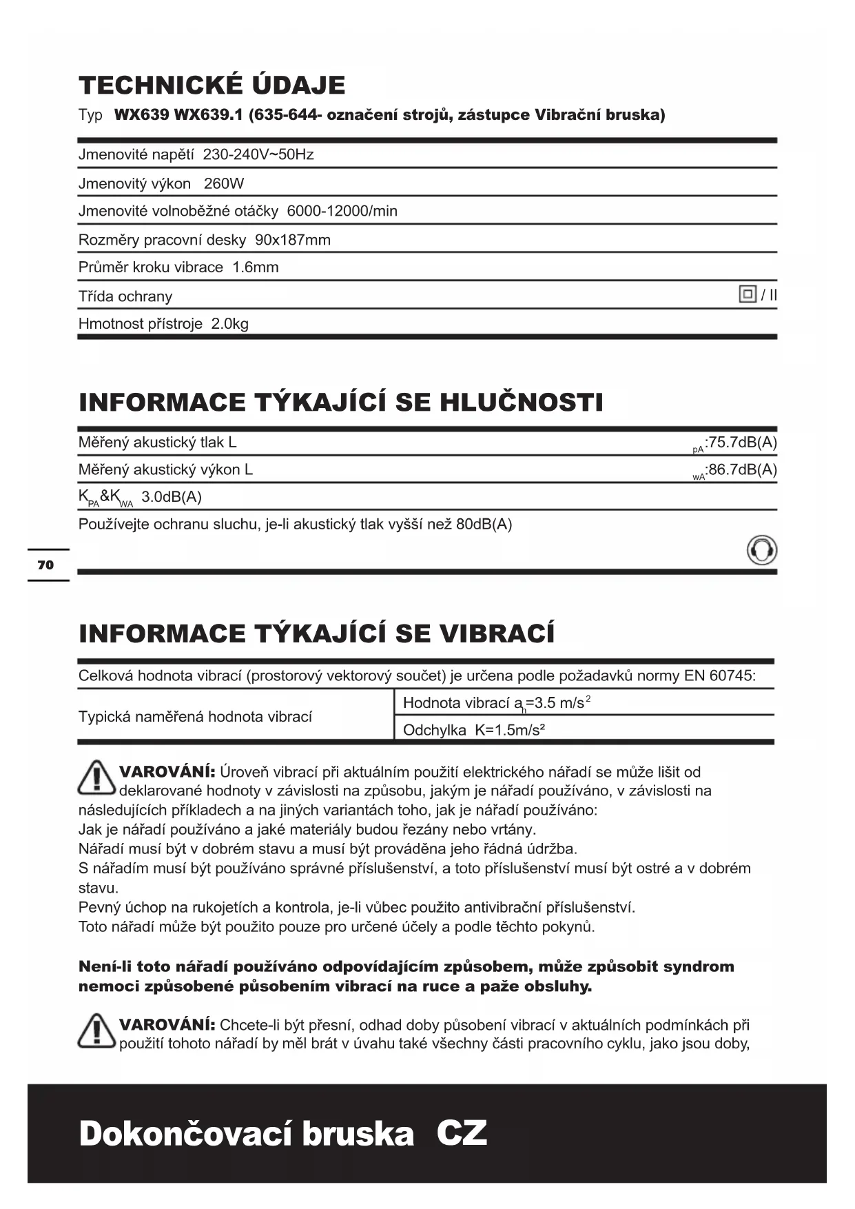 Typ Jmenovité napětí 230-240V~50Hz Jmenovitý výkon 260W Jmenovité volnoběžné otáčky 6000-12000/min Rozměry pracovní desky 90x187mm Průměr kroku vibrace 1.6mm Třída ochrany / II Hmotnost přístroje 2.0kg
