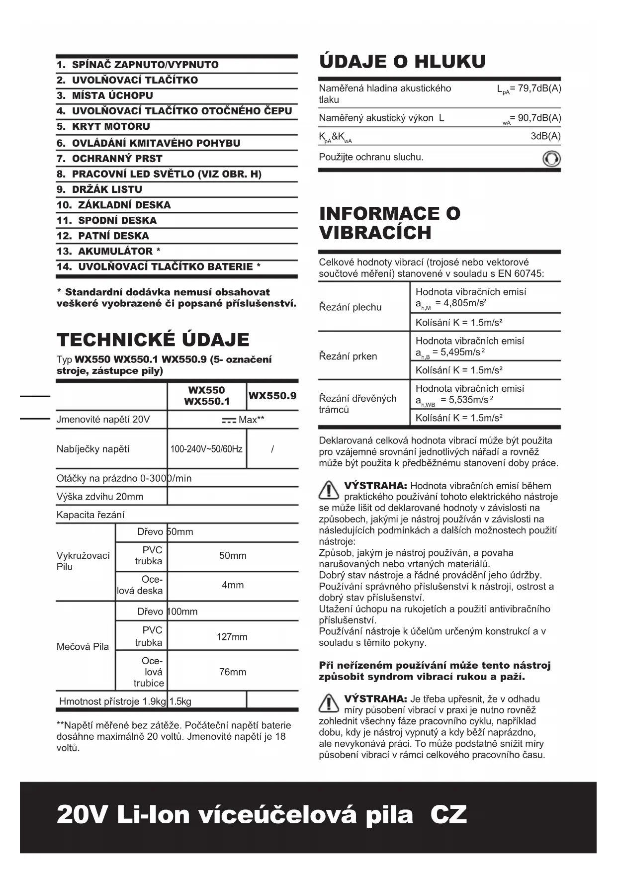 - Standardní dodávka nemusí obsahovat veškeré vyobrazené či popsané příslušenství. TECHNICKÉ ÚDAJE Typ WX550 WX550.1 WX550.9 (5- označení stroje, zástupce pily) WX550 WX550.1 WX550.9 Jmenovité napětí 20V Max** Nabíječky napětí 100-240V~50/60Hz