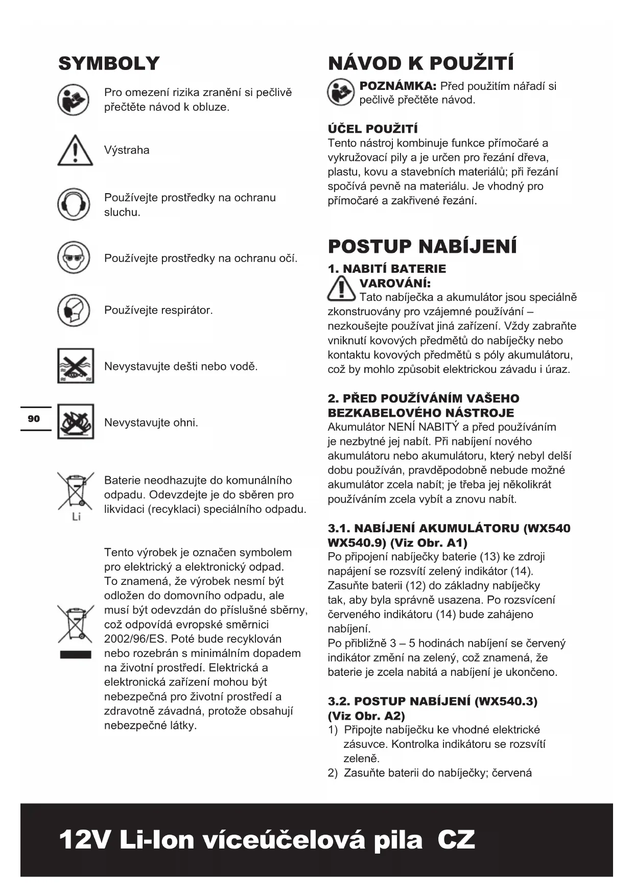 Pro omezení rizika zranění si pečlivě přečtěte návod k obluze. Výstraha Používejte prostředky na ochranu sluchu. Používejte prostředky na ochranu očí. Používejte respirátor. Nevystavujte dešti nebo vodě. Nevystavujte ohni. Baterie neodhazujte do komunálního odpadu. Odevzdejte je do sběren pro likvidaci (recyklaci) speciálního odpadu. Tento výrobek je označen symbolem pro elektrický a elektronický odpad. To znamená, že výrobek nesmí být odložen do domovního odpadu, ale musí být odevzdán do příslušné sběrny, což odpovídá evropské směrnici 2002/96/ES. Poté bude recyklován nebo rozebrán s minimálním dopadem na životní prostředí. Elektrická a elektronická zařízení mohou být nebezpečná pro životní prostředí a zdravotně závadná, protože obsahují nebezpečné látky.