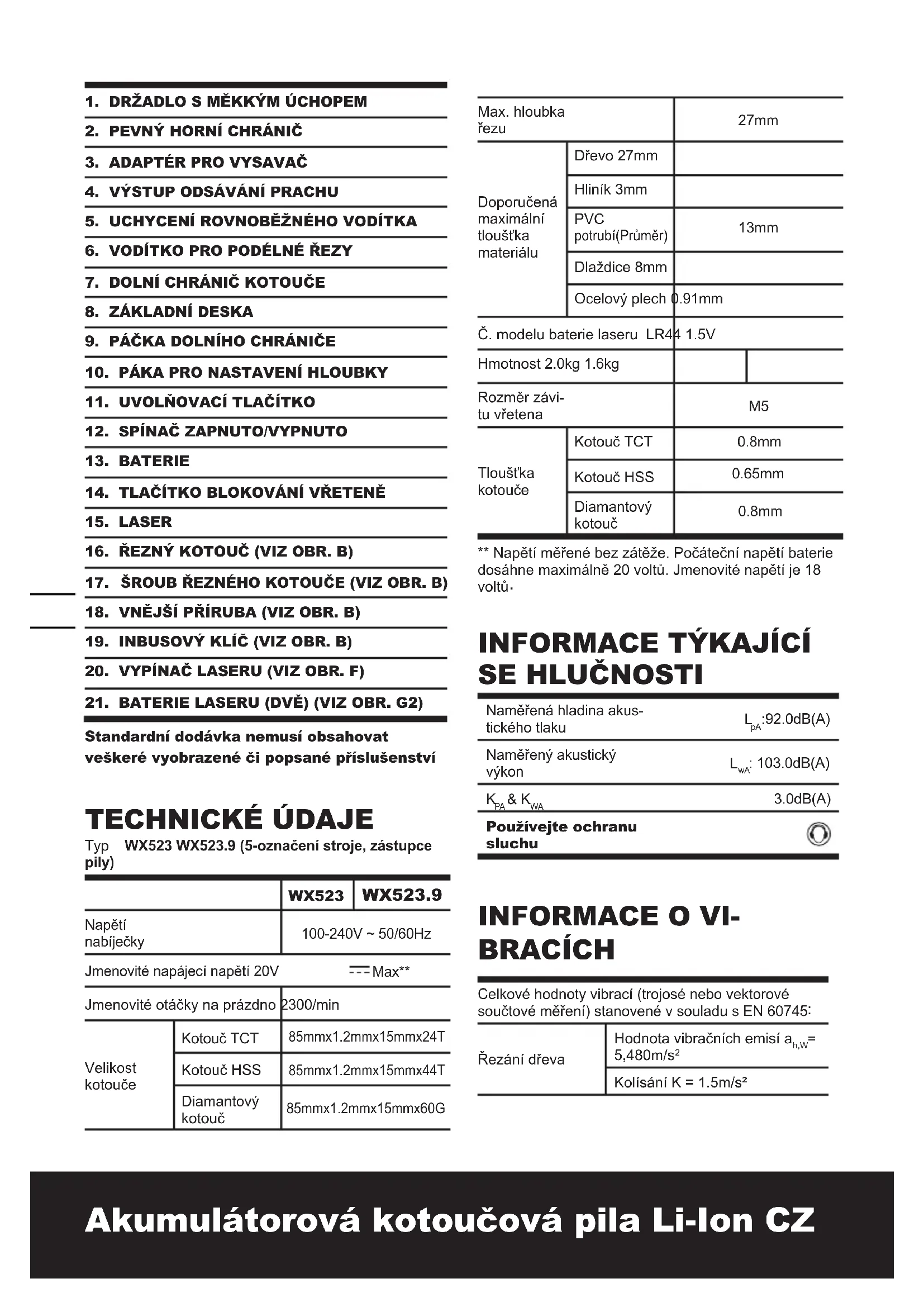 Standardní dodávka nemusí obsahovat veškeré vyobrazené či popsané příslušenství TECHNICKÉ ÚDAJE Typ WX523 WX523.9 (5-označení stroje, zástupce pily) WX523 WX523.9 Napětí nabíječky 100-240V ~ 50/60Hz Jmenovité napájecí napětí 20V Max** Jmenovité otáčky na prázdno 2300/min Velikost kotouče Kotouč TCT 85mmx1.2mmx15mmx24T Kotouč HSS 85mmx1.2mmx15mmx44T Diamantový kotouč 85mmx1.2mmx15mmx60G Max. hloubka řezu 27mm Doporučená maximální tloušťka materiálu Dřevo 27mm Hliník 3mm PVC potrubí(Průměr) 13mm Dlaždice 8mm Ocelový plech 0.91mm Č. modelu baterie laseru LR44 1.5V Hmotnost 2.0kg 1.6kg Rozměr závi- tu vřetena