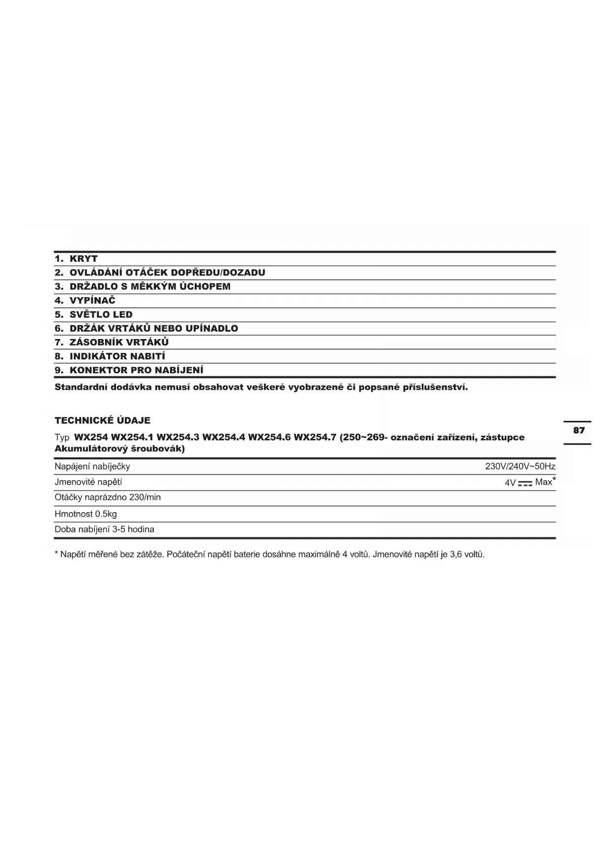 Standardní dodávka nemusí obsahovat veškeré vyobrazené či popsané příslušenství. TECHNICKÉ ÚDAJE Typ WX254 WX254.1 WX254.3 WX254.4 WX254.6 WX254.7 (250~269- označení zařízení, zástupce Akumulátorový šroubovák) Napájení nabíječky 230V/240V~50Hz Jmenovité napětí