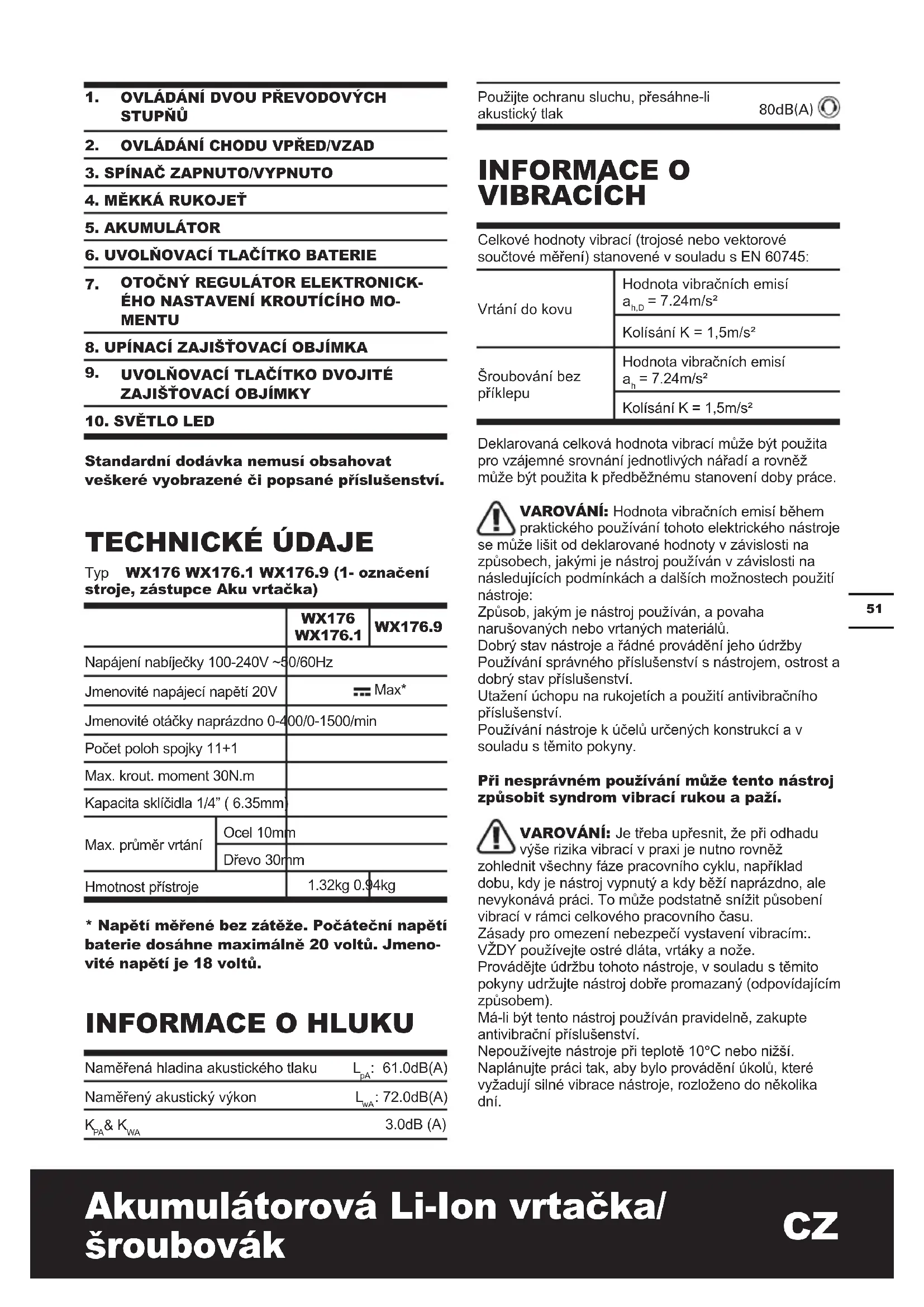 Standardní dodávka nemusí obsahovat veškeré vyobrazené či popsané příslušenství. TECHNICKÉ ÚDAJE Typ WX176 WX176.1 WX176.9 (1- označení stroje, zástupce Aku vrtačka) WX176 WX176.1 WX176.9 Napájení nabíječky 100-240V ~50/60Hz Jmenovité napájecí napětí 20V Max* Jmenovité otáčky naprázdno 0-400/0-1500/min Počet poloh spojky 11+1 Max. krout. moment 30N.m Kapacita sklíčidla 1/4” ( 6.35mm) Max. průměr vrtání Ocel 10mm Dřevo 30mm Hmotnost přístroje 1.32kg 0.94kg