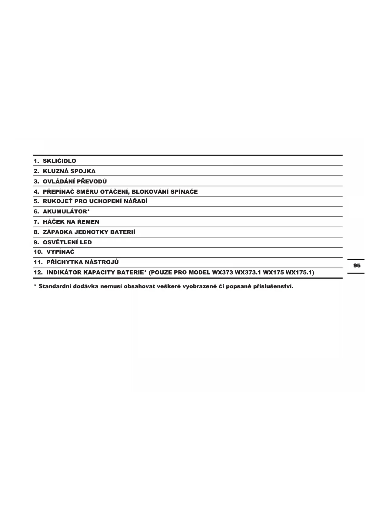 - Standardní dodávka nemusí obsahovat veškeré vyobrazené či popsané příslušenství.96 TECHNICKÉ ÚDAJE Typ WX175 WX175.1 WX175.2 WX175.9 ( 1 - označení stroje, zástupce Vrtačka napájená baterií) WX373 WX373.1 WX373.2 WX373.9 (3- označení stroje, zástupce Příklepová vrtačka) WX175 WX175.2 WX175.1 WX175.9 WX373 WX373.2 WX373.1 WX373.9 Napětí nabíječky 100-240V ~50/60Hz Jmenovité napájecí napětí: 20V Max** Jmenovité otáčky naprázno 0-600/0-2000/min Počet příklepu / 0-9600/0-32000BPM Počet poloh spojky 18+1 22+1+1 Max. krout. moment 60N.m Kapacita sklíčidla 13mm Max. průměr vrtání Ocel 13mm Dřevo 40mm Cihly / 16mm betonu / 13mm Hmotnost přístroje 1.55kg 1.83kg 1.19kg 1.58kg 1.85kg 1.21kg ** Napětí měřené bez zátěže. Počáteční napětí baterie dosáhne maximálně 20voltů. Jmenovité napětí je 18voltů.97