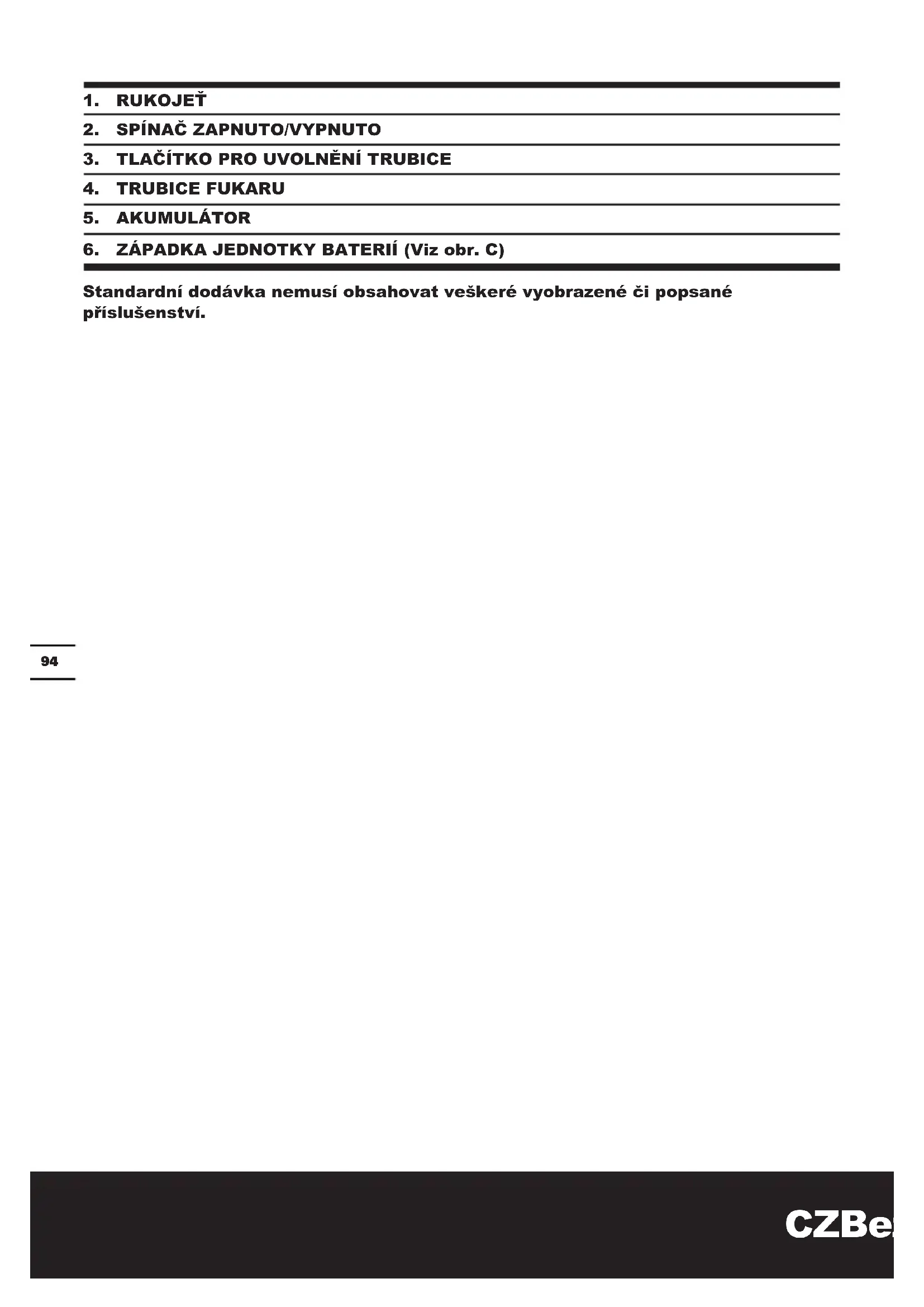 Standardní dodávka nemusí obsahovat veškeré vyobrazené či popsané příslušenství.CZBezdrátový Li-Ion foukač/zametač