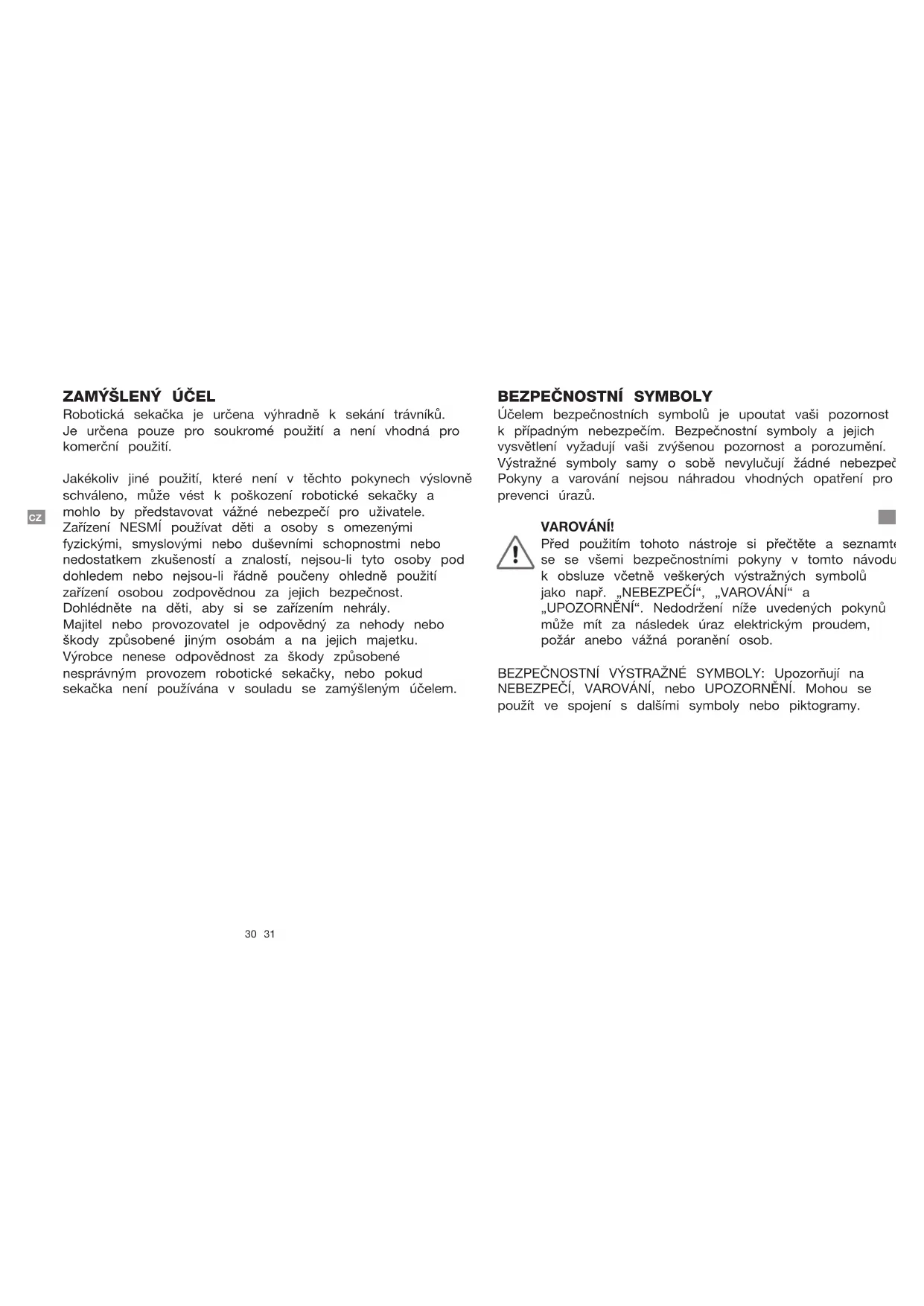 Na této stránce jsou zobrazeny a popsány bezpečnostní symboly, které se mohou objevit na výrobku. Před montáží a provozem si přečtěte, seznamte se a dodržujte veškeré pokyny ke stroji. Upozornění! Tyto pokyny musí být přečteny. Nebezpečí úrazu způsobené vymrštěným materiálem! Dbejte na to, aby přihlížející osoby byly v dostatečné vzdálenosti od stroje. VAROVÁNÍ - Nejezděte na stroji. POZOR - Nedotýkejte se rotující čepele. VAROVÁNÍ - Držte ruce a nohy mimo dosah rotujících čepelí. Nikdy nevkládejte ruce ani nohy blízko nebo pod těleso robotické sekačky, když je v provozu.34 35 CZ CZ