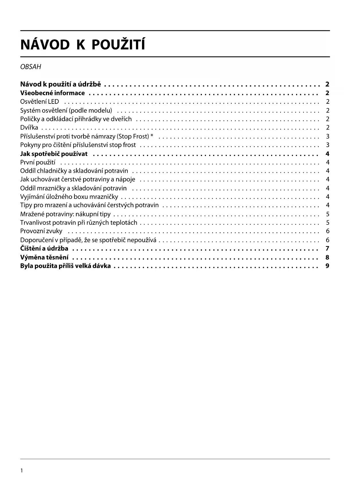 Výrobek Doba skladování 0‒3 °C Doba skladování (3–6°C) Doba skladování 6‒8 °C Plechovky, nápoje, vejce, omáčky, nakládaná zelenina, máslo, džem 3–4 týdny 3–4 týdny 3–4 týdny Tropické ovoce Nedoporučuje se 2–4 týdny 3–4 týdny Sýry, mléko, mléčné výrobky, lahůdky, jogurty 2–5 dní 2–5 dní 2–5 dní Nářezy ze studeného masa, zákusky, maso a ryby a doma připravené jídlo 3–5 dní 1–2 dny Nedoporučuje se Zde skladujte zeleninu a ovoce (kromě tropického ovoce a citrusů) 15 dní 10–12 dní 4–7 dníNávod k použití a údržbě