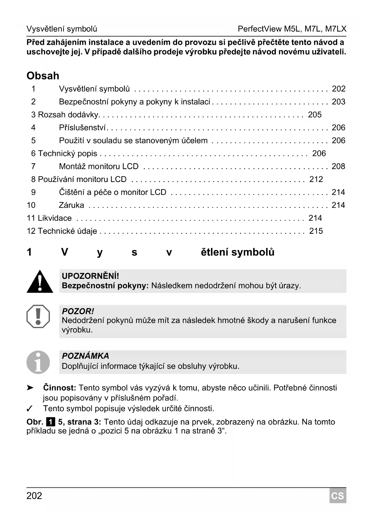 ➤ Činnost: Tento symbol vás vyzývá k tomu, abyste něco učinili. Potřebné činnosti jsou popisovány v příslušném pořadí. ✓ Tento symbol popisuje výsledek určité činnosti. Obr. 1 5, strana 3: Tento údaj odkazuje na prvek, zobrazený na obrázku. Na tomto příkladu se jedná o „pozici 5 na obrázku 1 na straně 3“. UPOZORNĚNÍ! Bezpečnostní pokyny: Následkem nedodržení mohou být úrazy. POZOR! Nedodržení pokynů může mít za následek hmotné škody a narušení funkce výrobku. POZNÁMKA Doplňující informace týkající se obsluhy výrobku.PerfectView M5L, M7L, M7LX Bezpečnostní pokyny a pokyny k instalaci