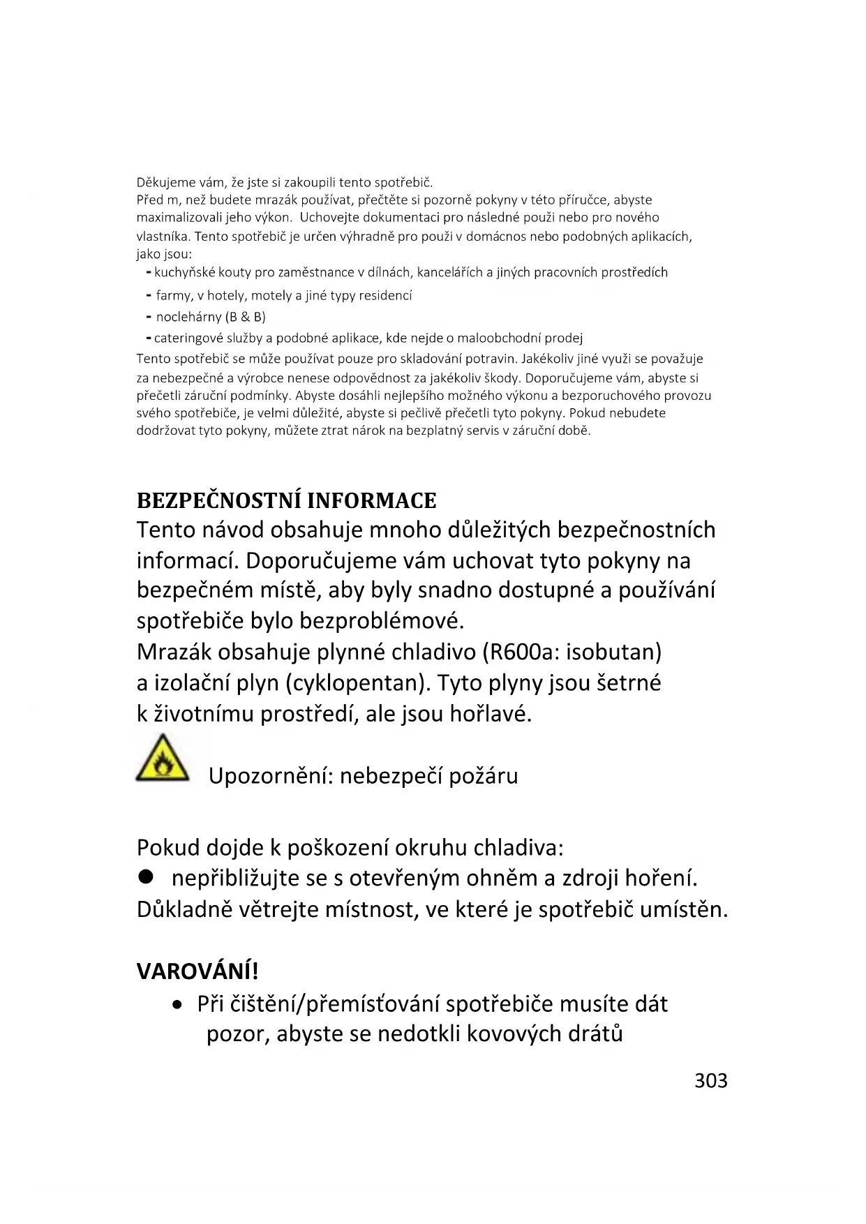 Tento spotřebič se může používat pouze pro skladování potravin. Jakékoliv jiné využi se považuje za nebezpečné a výrobce nenese odpovědnost za jakékoliv škody. Doporučujeme vám, abyste si přečetli záruční podmínky. Abyste dosáhli nejlepšího možného výkonu a bezporuchového provozu svého spotřebiče, je velmi důležité, abyste si pečlivě přečetli tyto pokyny. Pokud nebudete dodržovat tyto pokyny, můžete ztrat nárok na bezplatný servis v záruční době.