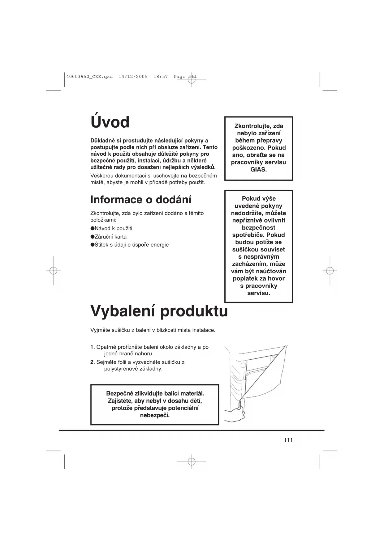 - Servis GIAS 40003950_CZE.qxd 14/12/2005 18:57 Page 110Důkladně si prostudujte následující pokyny a postupujte podle nich při obsluze zařízení. Tento návod k použití obsahuje důležité pokyny pro bezpečné použití, instalaci, údržbu a některé užitečné rady pro dosažení nejlepších výsledků. Veškerou dokumentaci si uschovejte na bezpečném místě, abyste je mohli v případě potřeby použít. Informace o dodání Zkontrolujte, zda bylo zařízení dodáno s těmito položkami: ● Návod k použití ● Záruční karta ● Štítek s údaji o úspoře energie Vyjměte sušičku z balení v blízkosti místa instalace. p. 127