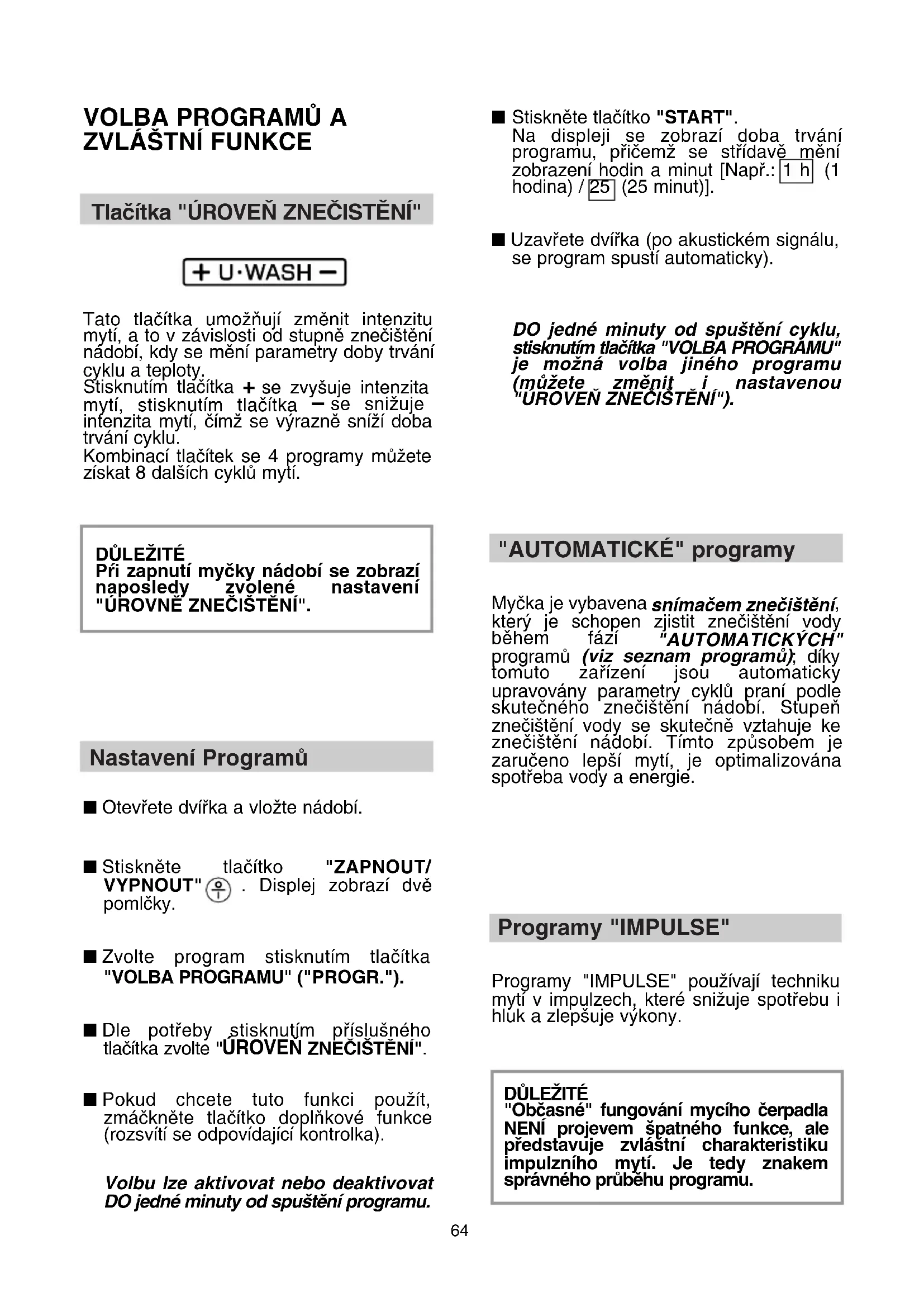 Tato myãka nádobí je vybavena bezpeãnostním zafiízením proti pfieteãení, které v pfiípadû poruchy vypou‰tí pfiebyteãnou vodu. POZOR! Aby nedo‰lo k neoãekávanému spu‰tûní funkce pojistky proti pfieteãení doporuãujeme Vám, abyste neh˘bali a nenaklánûli myãku nádobí bûhem chodu. V pfiípadû, Ïe je nutné s myãkou pohnout, nebo ji naklonit, zkontrolujte nejdfiíve, zda je ukonãen mycí cyklus a ve vanû myãky nezÛstala Ïádná voda.= Programy “IMPULSE”